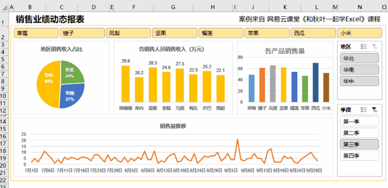 日常工作中,我们对于Excel表格的使用更多体现在数据汇总分析上,其实Excel中有很多神奇的工具,小编今天要介绍的就是切片器。 Excel中的切片器能干嘛?有什么作用? 快速筛选 打开Excel表格,插入切片器后,直接点击按钮筛选出对应的数据,  快速汇总 如果勾选出汇总行,那就可以直接点击按钮筛选并得到该类数据的汇总结果,  动态图表 如果以此表格为数据源制作图表,就可以通过单击按钮快速得到相应的图表,这是一项最为简单的动态图表技术。  3步搞定Excel动态图表,数据再多也能应对自如, 不仅仅是智能表格可以用动态图表。我在用透视表做数据分析时,也常常用它来快速查看分类统计的结果:  更厉害的是,这个遥控器可以一对多遥控多个透视表,只要这些透视表的源头是同一份数据,就可以把他们关联起来,实现联动的效果。  在处理Excel表格时可以灵活使用切片器,配合智能表格、透视表,足以让你应对各种灵活多变的统计需求。 毁车杀马拼音:huǐ chē shā mǎ释义:废弃车马。喻归隐意志坚决。出处:宋·陆游《谢曾侍郎启》毁车杀马,逝从此以径归;卖剑买牛,分余生之永已。”宋·陆九渊《与陈倅书》元晦虽有毁车杀马之说,然势恐不容不一出也。”示例:无 灵活使用Excel中的切片器,轻松应对各种统计需求众风光秀丽守株待兔星捧月15. 雨改变了公园的情调,西北方向的云雾之中,是水墨画似的远山,这在园林建筑中颇被称道的“借”来。13. 就我而言/ 就个人而言 As far as I am concerned, / Personally,范仲淹272.先天下之忧而忧,后天下之乐而乐。《岳阳楼记》 蝶恋花 晏几道花钿委地无人收,翠翘金雀玉搔头。Excel,表格The extent to which the broadcast media should be censored for offensive language and behavior involves a conflict between our right as individuals to freely express ourselves and the duty of government to protect its citizenry from potential harm. |