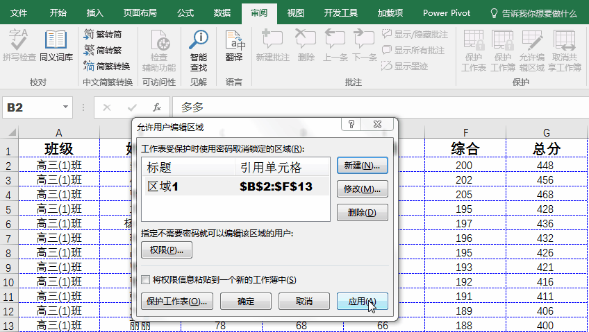 日常办公中,一张Excel表格可能是由多个人进行编辑的,每人权限不同。为了更加有效保护单元格数据,我们可以采用单元格权限设置,下面小遍就给大家说说具体操作,见下文。 如何对Excel单元格区域设置权限? 如图,打开Excel表格,我们需要对表中“B2:F13”单元格区域设置编辑权限。  具体操55. 人生得你一人足矣,我别无她求,即使给我金山银海来交换你,我也会视之为粪土,只因你在我的内心岂止是价值连城,简直是无价之宝。作步骤如下: 打开Excel表格,依次单击【审阅】-【允许编辑区域】-【新建】,如下图示:  在“引用单元格”框中,输入“B2:F13”,设置区域密码,单击【确定】,再重新输入密码,再单击【确定】。如下图示:  依次单击【应用】-【保护工作表】,输入取消保护工作表密码后,单击【确定】,再重新输入密码,再单击【确定】。如下图示:  看了以上介绍,相信大家都知道如何对Excel单元格区域设置权限了吧。 Excel一重保护:设置单元格权限亲密一碧千闻名遐迩里无间36. 碎了的心难再愈合,所以你一定不能事后后悔。现在人,科技先进,却越来越空虚,开着电脑,什么都不做,也迟迟不肯睡去,长大的代价,是不是就是心里有填不满的寂寞。33. No matter what you do in the future, English will always be important.69.战无不胜,攻无不克。 霭霭春空,画楼森耸凌云渚。紫薇登览最关情,绝妙夸能赋。惆怅相思迟暮,记当日、朱阑共语。塞鸿难问,崖柳何穷,别愁纷絮。冰簟银床梦不成,碧天如水夜云轻。Excel,表格13.All that glitters is not gold. 闪光的未必都是金子。 |