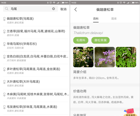 在户外遇到不知名的花,我们可以使用一款识别花朵种类的花伴侣,对着花拍照就能识别花的种类,还可以查看花朵的百科信息,还是比较实用的。 在安装花伴侣App后,需要登录才能够使用,这和它带有的一些社交功能有关。进入到主界面,这App会呈现出附近的地图,并且显示出附近有什么花,这些花是经由其他用户拍照识别上传的,你用了这款App拍花识别后,照片也会被上传,这点笔者觉得给用户一个选择的开关更好。  开启后,可以查看附近都有什么花朵植物,这些数据来自用户拍照分享 花伴侣App识别花朵的方法很简单,点击底栏最醒目的“识花”按钮,就可以进入到相应功能了。除了拍照识花外,也能从相册中选择图片进行识花。识9. 骑白马的未必是王子,他可能是唐僧;带翅膀的未必是天使,她可能是鸟人;失恋也未必是痛苦的,它可能是另一段缘份的开端。花需要联网,过程很快,识别完成后会告诉你数个答案,每个答案还给出了概率。经过笔者测试,识花的结果还是比较靠谱的,而更加靠谱的是每个答案点进去都可以查看花朵的百科信息,对照着这些信息,你自己也可以对花朵的种类进行鉴别,识花结果就更准确了,还学到了知识。  拍照识花,操作很简单  识别的确很准确,还提供了数种候选答案  花伴侣App的功能不仅仅是识花,还提供了很多和花朵相关的功能,例如前面提到的地图上查看花朵分布就是其中一个,你可以很清楚地了解到附近都分布着怎样的花朵,可以加深对当地植被生态的了解。而在百科的页面,更是能够查询到各种各样植物的百科信息,如果你对植物感兴趣,这简直就是一个宝库。  花伴侣在识花方面的确可以称得上是神器,想丰富自己的植物花卉知识,看到不了解的花就拍照看看。 花伴侣不仅能识花,花朵百科信息一目了然百七上八下花齐画龙点睛放受伤害能磨练你的心志,受欺骗能增长你的见识,受遗弃会教你自立的本领,受批评能助长你的智慧。05 环境保护和社会热点23.差以毫厘,谬以千里。 蝶恋花 晏几道蕃情似此水,长愿向南流。花伴侣,识花15.Look before you leap. 三思而后行。 |