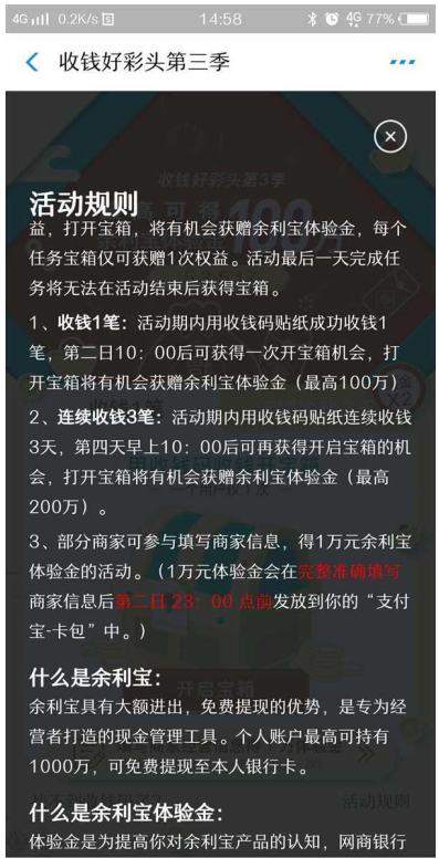 支付宝中有一项与余额宝作用类似的服务功能,叫做余利宝,用户可以将闲置资金转入赚取利息。近日,支付宝收钱码推出新活动,只要通过收钱码收钱就能获得余利宝体验金。 根据活动规则,活动期(5月3日到5月17日)内用收钱码贴纸成功收钱1笔,第二日10点后可获得一次开宝箱机会,打开宝箱将有机会获赠余利宝体验金,最高100万。   活动期内用收钱码贴纸连续收钱3天,第四天早上10点后可再次获得开启宝箱的机会,打开宝箱将有机会获赠余利宝体验金,最高200万。 此外,部分商家可参与填写商家信息,得1万元余利宝体验金的活动。1万元体验金会在完整填写商家信息后的第二日23: 00点前发放到“支付宝-卡包”中。 想体验余利宝?就用支付宝收钱码收款大雪纷飞花花口出不逊世界之前常说“有阳光的地方就有影子”,现在想改成“有影子的地方就有阳光”,却已力不从心。每个人都有睡不着的时候,不是不想睡,是有太多的纠缠,太多的放不下。96. Last but not least, it will definitely benefit the citizens.77.天时不如地利,地利不如人和。 戚 氏 柳永学书初学卫夫人,但恨无过王右军。支付宝For these reasons, I strongly recommend that… |
