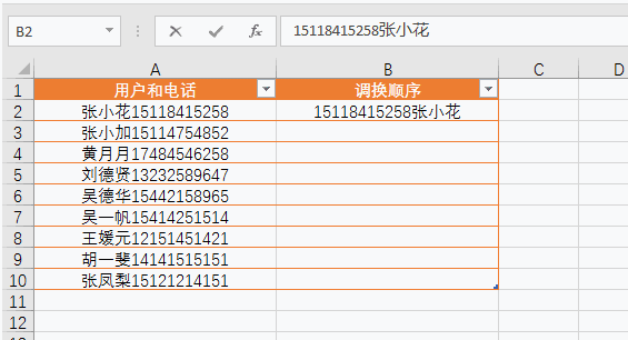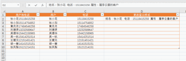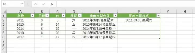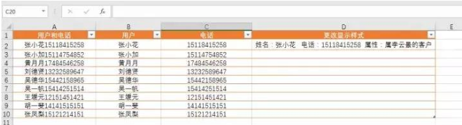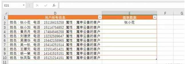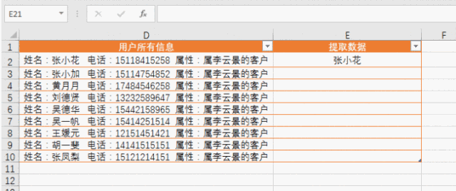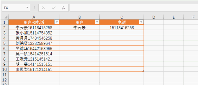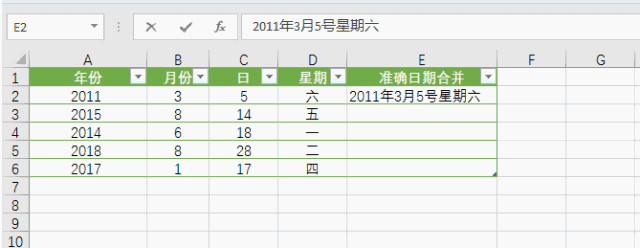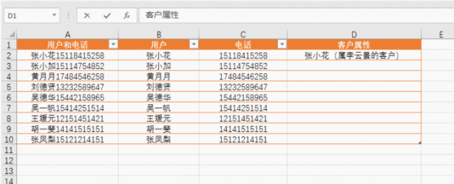 处理Excel表格数据少不了各种函数、快捷键操作,今天小编要给大家介绍的是CTRL+E组合键,下面举例讲解它的作用。 合并所有日期 如下Excel表格,我需要把所有日期合并在一起,  只需要写一行:2011年3月5号星期六,然后把光标放到下一行需要合并的单元格内,使用Ctrl+E快捷键就可以全部填充。  更改日期样式 我现在想要更改日期的显示样式,也可以使用Ctrl+E快捷键 我们在第一行写好一行Excel可以识别的样式:2011.03.05.星期六  然后把光标放到下一行需要合并的单元格内,用Ctrl+E快捷键就可以全部填充。  拆分显示手机号码 我们收集到的数据经常是这样的:没有拆分的数据  如果我们一个个拆分的话,要是有几百个客户,就麻烦了。 我们先写好第一行,让Excel能够识别拆分的样式。然后把光标放到下一行需要合并的格子内,使用Ctrl+E快捷键就可以全部填充。  添加说明属性 我们继续在下面这个表格最后面添客户的属性。客户属性:张小花(属李云景的客户)  同样的做法,我们先写好第一行,让Excel能够识别拆分的样式:张小花(属李云景的客户) 然后把光标放到下一行需要合并的格子内,使用这个快捷键:Ctrl+E,就可以全部填充  更改显示样式 如下图,我们先写好第一行,让Excel能够识别拆分的样式:姓名:张小花 电话:15118415258 属性:属李云景的客户  然后把光标放到下一行需要合并的单元格内,使用Ctrl+E快捷键就可以全部填充。  调换顺序 我们现在先把下面的名字和电话顺序调换。  我们先写好第一行,让Excel能够识别拆分的样式:15118415258张小花 然后把光标放到下一行需要合并的格子内,使用Ctrl+E快捷键就可以全部填充。  提取数据 我们现在想把下面用户所有信息中提取名字的数据。  我们先写好第一行,让Excel能够识别拆分的样式:张小花 然后把光标放到下一行需要合并的单元格内,使用Ctrl+E快捷键就寸步难行拼音:cùn bù nán xíng释义:连一步都难以进行。形容走路困难。也比喻处境艰难。出处:唐·杜甫《九日寄岑参》出门复入门,雨脚但如旧。所向泥活活,思君令人瘦……寸步曲江头,难为一相就。”示例:美娘赤了脚,~。★明·冯梦龙《醒世恒言》卷三可以全部填充。  处理Excel数据少不了CTRL+E组合快捷键,大家可以多多练习、早日掌握技巧。 处理Excel数据少不了CTRL+E,就是这么好用!惟绝无仅有不甘示弱我独尊38. 宽容似火。因为更进一层的宽容,不仅意味着不计较个人得失,还能用自己的爱与真诚来温暖别人的心。心平如水的宽容,已是难得;雪中送炭的宽容,更可贵,更令人感动。宽容,能融化彼此心中的冰冻,更将那股爱的热力射进对方心中。在这充满竞争的时代,人们所需要的不正是这种宽容吗?选择宽容,也就是选择了关爱和温暖,同时也选择了人生的海阔天空。现在,我想这真是一次成功的经历,并且我完全理解了劳动的意义。365.冤家宜解不宜结,各自回头看后头。《古今小说》 起来携素手,庭户无声,时见疏星渡河汉。试问夜如何?夜已三更。金波淡,玉绳低转。但屈指西风几时来?又不道流年暗中偷换。轻拢慢捻抹复挑,初为霓裳后六么。Excel,快捷键31、Walls have ears. |
