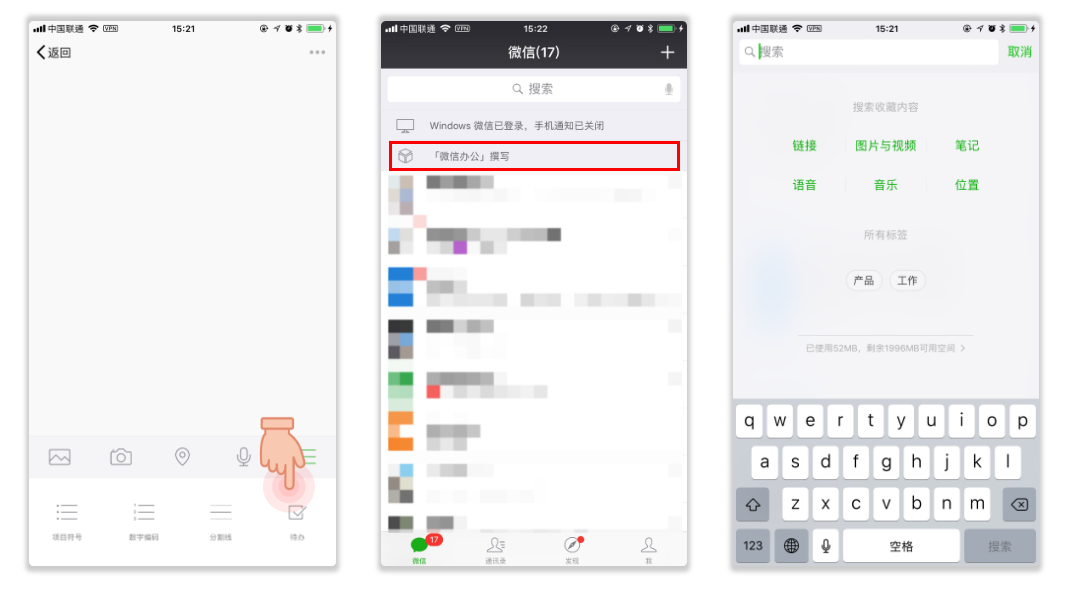 微信不仅用于日常朋友联系,因为工作需要,微信也成为了办公常用工具,如何高效率的使用微信办公呢?一起来看看。 对话设置「提醒」 当收到同事或领导发来微信办公内容时,我们虽然会及时回应,但是却又常常忘记。这时,其实你可以将对话内容长按设置提醒时间,让工作如期完成。不过,微信提醒不支持 1 小时内的时间。 操作步骤:长按对话内容 - 点击最右的「三角箭头」 - 选择「提醒」,然后设定提醒的时间即可。微信将会在你设定的时间到来时将该内容通知给你。  快速定位「聊天内容」 很多时候,微信的办公环境常体现在「群聊」的成员交流中,但毫无主次且内容众多的时间线,会让你在寻找和工作相关的内容时非常麻烦,不能快速定位。这时候,我们可以通过「查找聊天内容」来解决。 在微信群聊详情界面中,点击「查找聊天内容」,这时界面除了搜索框外还有 7 个快速搜寻的子选项(群成员、日期、图片及视频、文件、链接、音乐、交易)。这意味着查找聊天内容时你可以先选择以上任意一个选项,再进一步搜寻,快速定位。 例如:我想查找 A 在群聊中的发言记录时,点击「群成员」- 选择 A ,即可出现 A 在群聊中的聊天内容。  当然了,查找内容是建立在未删除群聊聊天记录的基础上。 学会多利用「收藏」与「笔记」 微信的「收藏」其实是一个很容易被人轻视的功能。它不仅支持对收藏的多种格式资料进行标签整理,还支持多功能的笔记记录和手机与电脑端的同步。 当同事发来办公文件或自己看到值得保存的文件时,你可以收藏起来进行标签分类;当需要用到时,不仅可以方便打开,还可以在聊天窗口将「收藏」中的文件发送出去。  在「收藏」中,你还可以添加笔记。 当你在处理收藏文件时或公司会议讨论中需要笔记记录时,你可以在「收藏」界面中点击右上角的「+」开始记录内容。「笔记」不仅可以插入图片、地址、语音,还支持添加待办事项;如果你怕任务被遗忘,你还可以将其44. 我失去过感情,也知道爱如覆水,去了难收。所以只有把这种忧伤交付给时间去化解,相信爱情走就是走了,而不强加挽留。在聊天界面中置顶。笔记的所有文件都支持发送给他人,甚至还支持保存为图片后再分享。  同样地,微信还为「收藏」提供了快速搜寻支持。令人遗憾的是,每个微信用户的「收藏」空间仅为 2 GB。 调用其他存储空间 在前面,我们提到了微信「收藏」有限的存储空间,一旦涉及到更多(大)的办公文件整理时,它便无能为力。这时,就需要调用其他存储空间。在 iOS 版本中,微信支持直接调用系统原生的「文件」应用 ,你不仅可以将文件存储至内,还可以将其内容对外发送。 存储操作步骤:对话窗口中点击文件并下载 → 用其他应用打开 → 存储至「文件」。  发送 操作步骤:对话窗口点击「+」选择「文件」,调用 iCould Drive(或者其他存储服务,例如 Dropbox、坚果云……),选择所需文件发送即可。 同时你也可以使用专业办公应用联动微信,它们将会辅助你更好地办公。 微信办公小技巧,手机也能高效办公火烧秋菊傲拔刀相助骨眉毛18. 岩石下的小草教我们坚强,峭壁上的野百合教我们执着,山顶上的松树教我们拼搏风雨,严寒中的腊梅教我们笑迎冰雪。5.人们普遍认为 It is commonly believed/ recognized that…356.万事俱备,只欠东风。 篆缕消金鼎。醉沉沉、庭阴转午,画堂人静。芳草王孙知何处?惟有杨花糁径。渐玉枕、腾腾春醒,帘外残红春已透,镇无聊、殢酒厌厌病。云鬓乱,未忺整。186杜甫:登高微信,微信办公23、Practice makes perfect. |