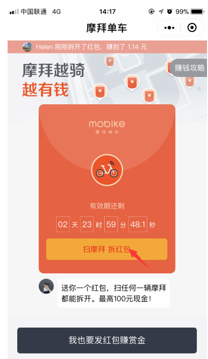 注意啦,摩拜单车推出了新一轮的红包活动,只要你发红包给好友,好友骑行单车后你就可以赚赏金。下面我们就来看看摩拜单车发红包赚赏金的活动玩法以及规则介绍,如下。 摩拜发红包赚赏金怎么玩? 1、打开微信扫一扫,扫描下方二维码,识别小程序后即可领取现金大礼包;  2、这时点击扫摩拜拆红包,如图;  3、允许权限后,扫码解锁摩拜单车并骑行,就可以获得现金红包啦,就是这么简单~  活动规则 1、邀请及赏金规则 a)参与活动的用户可以分享链接、二维码图片邀请其他摩拜单车用户; b)如果被邀请用户领取了红包,并在有效期内完成有效骑行,则发出邀请的用户可以获得一笔赏金,金额与被邀请者获得的随机金额红包相同; c)赏金需用户点击进行领取; d)赏金有效期为14天(336小时),有效期自好友完成骑行开始计算;如未在有效期内领取,有效期结束后红包将自动过期失效。 2、骑行红包规则 a)针对同一邀请者分享的链接或图片,每个被邀请用户每天仅可从中领取一次红包; b)被邀请用户领取红包后,需完成骑行或红包超出有效期后才可再领取下一个红包; c)红包有效期为3天(72小时),有效期自领取成功开始计算; d)在红包有效期内,被邀请用户完成有效骑行即可拆开红包获得金额奖励。 3、翻倍卡规则 a)在摩拜单车小程序中将红包分享到3个或以上不同的群,即可获得一张赏金翻倍卡; b)赏金翻倍卡将自动使用,自完成分享到3个不同的群并获得翻倍卡起,得到的第一笔赏金将自动翻倍。 4、领取到的奖励将存入该用户的微信支付零钱中;用户需绑定微信账号领取赏金,如未绑定微信账号,奖励将无法发放;如果你未在微信中完成实名认证,我们无法将奖励发放至你的微信零钱。如因未绑定微信账号、在微信中未完成实名认证导致你无法领取奖励,视同你自动放弃奖励。 5、本次活动红包及赏金,均由活动组织方摩拜单车与微信支付出资提供,用户无需承担任何费用。 6、活动仅限用户使用摩拜单车手机客户端7.2.0及以上版本或摩拜单车微信小程序参加。 7、不允许同一用户下不同账号之间发起邀请;若存在使用同一摩拜账号、同一身份证号码或同一微信账号的,符合任意一项,均视为同一用户。 8、寸步不让拼音:cùn bù bù ràng释义:连寸步也不让给别人。形容丝毫不肯让步、妥协。出处:清·梁启超《十种德性相反相成义》盖西国政治之基础,在于民权,而民权之巩固由于国民竞争权利寸步不肯稍让,即以人人不拔一毫之心,以自利天下。”示例:无对于以任何不正当方式参与活动的用户,包括但不限于恶意注册、恶意套现、利用程序漏洞等,微信支付与摩拜单车均有权各自取消该用户的参与资格。 9、在邀请他人领取红包时,禁止采用滥发短信、邮件等骚扰行为,并请遵守广告、环境保护相关的法律法规以及相关地方政策规定。 摩拜新玩法:骑行单车即可赚赏金,别错过哦五颜六色志同道合秋高气爽8. 我愿长年地守望你,熟悉你的潮汐变幻,了解你的每一拍波涛。我将尝试着同时去爱你那忧郁沉静的蓝和春明亮的白——甚至风雨之夕的灰浊。50. Views on the issue in question vary from person to person.193.随风潜入夜,润物细无声。《春夜喜雨》 渡头杨柳青青,枝枝叶叶离情。此后锦书休寄,画楼云雨无凭。其间旦暮闻何物?杜鹃啼血猿哀鸣。摩拜单车23、Practice makes perfect. |