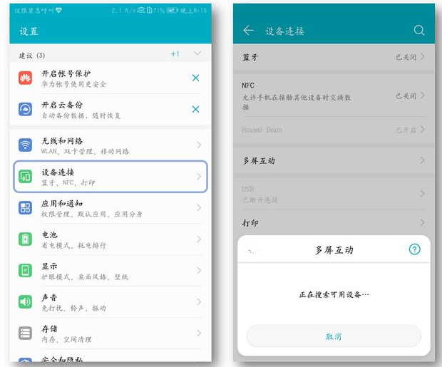 华为手机中内置了一项“多屏互动”功能,使用该功能可以将手机上的内容投屏到电视,下面我们就来说说华为多屏互动功能的使用方法,请看具体介绍。 多屏互动常用的投屏功能有DLNA和Miracast,它会根据不同的设备启用对应的功能,最终实现相对一致的内容共享效果,下面给大家讲解一下两种功能如何使用。 DLNA DLNA需将手机和电视或者盒子连接同一WiFi【仅用于远端传输播放媒体文件(音视频、图片等),TV端画面和手机端不一致】 安卓系统中部分播放器就具备DLNA功能,例如腾讯视频、搜狐视频、迅雷看看就有这功能,可以将原来应该在手机屏幕的影片转移到超级电视或者乐视盒子端显示,但需要手机支持DLNA功能,并且需要将手机和超级电视置于同一WiFi网络。 下面以腾讯视频为例,演示具体使用方法 1) 手机和超级电视处于同一WiFi网内。将超级电视的“多屏互动”功能开启,该选项在“设置”--> "系统”-->“多屏互动”。    2) 打开手机上的“腾讯视频”应用,进入“我的”菜单,选择“投电视”功能。  3)手机播放视频时,轻触视频右上角的TV选项,即可投电视。  Miracast27. 失恋首先是一种幸运,其次才是不幸。失恋,证明我们真正的爱过了。如果没有的话。也就无所谓失恋。那些三天两头喊失恋的人,肯定是不会用多少真情的。 支持此标准的设备可通过无线方式分享视频画面,用户只需将手机和盒子或者电视的WiFi打开就可以,不必要求在同一个网络下,TV端和手机端画面一致。 手机可通过Miracast将影片或照片直接在电视或其他装置播放而无需受到连接线缆长度的影响。与DLNA不同的是,Miracast可以将手机屏幕内容直接投屏到超级电视屏幕上,这样你也可以通过电视屏幕来玩游戏了。 1)进入超级电视设置菜单,找到Miracast项目,确认后进行设置。  2)将Miracast设置为“开启”。此时超级电视进入2分钟倒计时,以便附近设备检测到。  3)打开手机设置菜单,选择“设备连接”项目,将“多屏互动”开关开启,手机即开始搜索显示设备,点击搜索到的设备名称即可进行Miracast连接。  4)连接成功后,手机桌面就同步投屏到了超级电视上,瞬间就让你拥有一个超大屏手机。  上述操作步骤在不同的超级电视和盒子上可能会存在一些差异,但是大体流程基本是一致的。 华为手机的“多屏互动”功能你用了没?还不错哦一碧千里有林海雪原口无心30. 亲情能滋润人的心田,使生命之舟洒满阳光;它是一种隐藏在每个人内心深处的一种而深厚的情感,它可以冲破时间空间的阻碍,让两颗心紧紧相拥。20.…也不例外 …be no exception[NextPage]265.人面不知何处去,桃花依旧笑春风。崔护《题都城南庄》 东城渐觉风光好,彀皱波纹迎客棹。绿杨烟外晓云轻,红杏枝头春意闹。及兹契幽绝,自足荡心耳。手机,投屏17.Great minds think alike. 英雄所见略同。 |