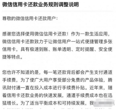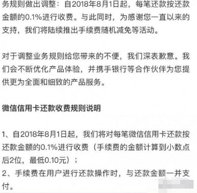 很多用户每个月都需按时间还信用卡,微信中就有信用卡还款的功能,就在昨天,微信理财通发出了一个重磅公告,微信的信用卡还款开始收费了,手续费还不低,一起来看看具体标准吧。  微信官方宣布: 1、自2018年8月1日起,每一笔还款按还款金额的0.1%进行收费(手续费的金额计算到小数点后2位,最低0.1元) 2、手续费在用户进行还款操作时,与还款金额一并支付。 3、将陆续推出手续费随机减免等活动。  为什22. 每个人的性格中,都有某些无法让人接受的部分,再美好的人也一样。所以不要苛求别人,也不要埋怨自己。么要收费? 因为成本太高了,微信官方这么解释: 因每一笔还款背后都会产生支付通道手续费,腾讯财付通一直在投入成本进行手续费补贴。 近年来,随着信用卡还款业务的快速发展,通道手续费成本也在迅猛增长。  想要免费还信用卡,就用下面的这几个方法吧! 1、支付宝。 目前还没有看到信用卡还款收费的公告,但也不排除以后会跟进。 2、各大手机银行APP 在办理信用卡的时候,工作人员一般都会主动建议用户下载该银行的手机银行APP,只要绑定相应的借记卡,就可给本行的信用卡进行还款,跨行还款免费,还能享受各个银行的签到,做任务等运营福利,目前各大银行APP也逐渐开通了给他行信用卡还款的功能。 3、京东金融、苏宁金融这样的APP 用京东金融信用卡还款,经常会有一些优惠活动,还款成功送你一些优惠券。 而如果是苏宁的深度用户,不妨用用苏宁金融信用卡还款。 4、银联的“云闪付”APP 银联云闪付也可还信用卡,而且没有手续费。 天下没有白吃的午餐,这些免费的有信用卡还款功能的app估计很快也会收费了。 微信还卡手续费这么高!支付宝、京东等都免费鹤发高谈阔雪上加霜论童颜29. 取一枚青苔寄予流年,于月影下,静听远古传来的吟唱,这是生命中从没有体验过的一种精神快感。任何感兴趣的学生都可以来参加。高明《琵琶记》347.不是一番寒彻骨,怎得梅花扑鼻香。 阑干倚尽犹慵去,几度黄昏雨。晚春盘马踏青苔,曾傍绿阴深驻。落花犹在,香屏空掩,人面知何处?分野中峰变,阴晴众壑殊。微信,信用卡还款36.To live is to learn,to learnistobetterlive.活着为了学习,学习为了更好的活着。 |