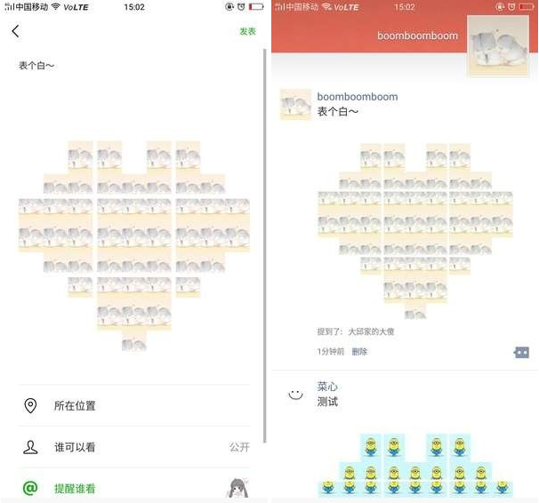 朋友圈配图能有什么花样呢?最近在朋友圈里刷到了心形九宫图,超级新颖的,今天小编就把方法教给大家,也到自己的朋友圈里去炫酷一把。  微信朋友圈心形九宫格配图怎么制作? 在美图秀秀首页点击【拼图】,上传9张图片,拼图排在第6、8、9位置,其他位置放白图,然后点毁瓦画墁拼音:huǐ wǎ huà màn释义:打碎屋瓦,涂灭已画好的田地界线。比喻一种无益不害的行为。出处:《孟子·滕文公下》[孟子]曰‘有人于此,毁瓦画墁,其志将以求食也,则子食之乎?’”赵岐注孟子言人但破碎瓦,画地则复墁灭之,此无用之为也,然而其意反欲求食,则子食乎?”示例:将其藉兹遣日,如~者所为耶?★章炳麟《五无论》击【开始拼图】这里记得选择【无边框】的【九宫格】模板,完成后点击右上角的【√】即可保存。  第1张:3张拼图+6张白图,拼图排在第6、8、9位置,其他位置放白图按照以下九张图的排序进行拆分讲解;  第2张:5张拼图+4张白图拼图排在第4、6、7、8、9位,其他位置放白图;  第3张:3张拼图+6张白图拼图排在第4、7、8位,其他位置放白图;  第4张:8张拼图+1张白图拼图排在第1、2、3、4、5、6、8、9位,7位放白图;  第5张:9张拼图,全部放拼图;  第6张:8张拼图+1张白图拼图排在第1、2、3、4、5、6、7、8位,9位放白图;  第7张:1张拼图+8张白图拼图排在第3位,其他位置放白图;  第8张:7张拼图+2张白图拼图排在第1、2、3、4、5、6、8位,其他位置放白图;  第9张:1张拼图+8张白图拼图排在第1位,其他位置放白图;  9张拼图都制作完成后,按照排列顺序发布朋友圈,就可以呈现心形效果了。  难道不难,就是有点费心思,有时间可以玩玩哦。 朋友圈心形九宫图怎么发?超级新颖的滴水不漏春雷千钧一发滚滚38. 喜欢下雨的天气,因为那个时候人的情绪总是变得比较低落,很多互相打扰的事件因此降低。conduct activities 开展活动;a variety / varieties of 各式各样的274.碧云天,黄叶地,秋色连波,波上寒烟翠.山映斜阳天接水,芳草无情,更在斜阳外! 黯乡魂,追旅思,夜夜除非,好梦留人睡。明月楼高休独倚。酒入愁肠,化作相思泪。《苏幕遮?碧云天》 归云一去无踪迹,何处是前期?狎兴生疏,酒徒萧索,不似去年时。074高适:燕歌行并序朋友圈,心形九宫图制作22、Youth will be served. |