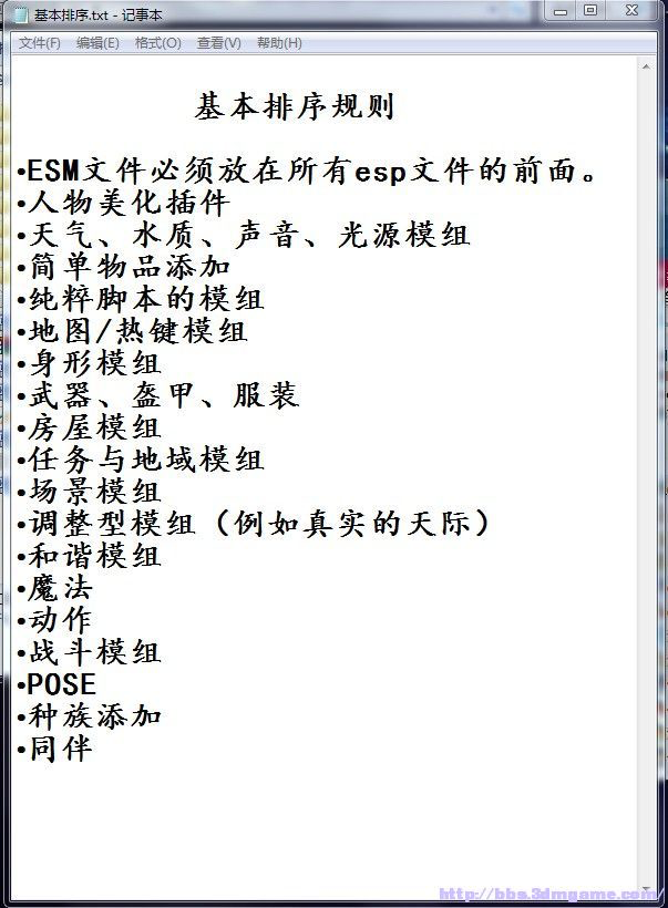 三、在MO里面添加相关工具 注意:用了MO,几乎所有相关工具都需要通过MO来启动,不然会无法正常读取MO安装过的Mod。但是有些工具的安装并不一定需要通过MO,如之前安装的Fnis,你也可以通过直接解压到游戏data来安装,但是启动必须通过MO。 接下来就讲一下怎么给MO添加相关工具,以前面的Fnis为例: 1. 通过右侧的【数据】栏添加 在右侧【数据】(Date)栏里的tool中找到tools下的ForUsers.exe,右键添加为可执行程序,这是最正确的安装姿势,可以保证不会出错。 2. 通过右侧的【编辑】快捷方式添加 在右侧的【编辑】中通过浏览搜索可执行程序来添加     3. 通过左侧的小齿轮添加 四、Mod排序 排序可能是不少新手头疼的问题,尤其是遇到频繁闪退的时候,不过闪退这东西经常跟Mod排序关系不大。MO不用在意Mod的安装顺序,但是排序是很有必要的。 下图是基本排序表,可以参考。  MO的排序原则: 1. 下层覆盖上层 2. esm排在esp上面 3. 没冲突和良性冲突的mod随意排 4. 有要求的按要求排 问题小结: 1. 左边资源文件排序优先注意带有闪电符号的Mod,根据覆盖情况和你要达到的效果来排。如果不带闪电符号基本不需要排序; 2. 当两两Mod有冲突发生时(包括),左边资源文件和右边esm/esp文件的排序要对应。注意这里的排序指的只是上下顺序的对应,并不用非得挨着; 3. 左右两边的排序部分情况下可以相互参考。如果你对左边资源文件排序不确定,看看右边LOOT调整过的esm/esp排序,也许能给你一定启发。 PS:如果你完全是个新手,或者是懒癌重度患者,那么也可以不用管左边的排序。但是右边一定要用LOOT排序。 五、关于闪退等问题1. 闪退 闪退原因太多了,硬件配置差、内存问题、脚本错误、存档错误、排序冲突等等都有可能导致闪退。 2. 没有声音 游戏的文件夹里面找到DirectX10文件夹,5. 生命像流水一样逝去,如是自己所愿,一定竭尽全力地坚持,如果已经一败涂地,那就痛痛快快地哭上几回,再潇洒地一笑:让一切随风而去,因为没有人在原处等你!里面有个DXSETUP.exe程序,运行它,重装一遍声音文件。(其他游戏此问题也可以参考这种办法) 3. fnis没有性别文件夹 解决方法为,在FNIS的data/meshes/actors/character/animations这个文件里分别创建female跟male文件。 六、MO必备工具 看完了上面的教程,想必你对如何使用MO已经了若指掌了。那么,下面就让我们通过安装几个MO必备的运行工具来牛刀小试,踏出成为大神路上的第一步吧! 1.《上古卷轴5:天际》SKSE 脚本扩展工具 SKSE 是一款很多 MOD 都需要使用到的前置脚本扩展工具,算是老滚 5 玩家必备的工具。这也是你以后启动游戏的工具。 2. 《上古卷轴 5》菜单美化补丁SkyUI汉化版 这是《上古卷轴 5》菜单美化补丁,不仅美化了菜单,也是部分MOD的前置补丁 3.《上古卷轴 5 天际》LOOT排序工具 这是《上古卷轴 5 天际》的自动排序工具(右侧排序)。有了它你就不需要研究让人一个头两个大的Mod排序规则,只需要一键LOOT,轻松搞定。 4.《上古卷轴 5》FNIS 《上古卷轴 5》FNISv7.4.5是《上古卷轴 天际》的必备插件FNIS工具,所有人物及其他生物的新动作都需要它来进行更新。即便不装MOD,它本身也会更新原版游戏中人物的动作等。所有添加或修改Mod的行为,最后都必须要运行一下FNIS(这也是为什么我要把它放在最后的原因) 本教程到这里也就结束了。小伙伴们,学会了吗?快进游戏尽情体验Mod的乐趣吧! MO超详细小白入门教程(二)络四分天寒地冻五裂绎不绝7. 人生的路途漫长又曲折,在前行的路上我们也许会迷失了方向,也许会沉迷于路景,很多的迷雾和错误的路标会误导我们,让我们无法前行甚至使我们朝相反的方向前进,此时,我们只有找到自己的位置,才能一步步地接近目标,接近成功。take ... for granted (that) 认为……理所当然黄庭坚294.桃李春风一杯酒,江湖夜雨十年灯。《寄黄几复》 闹红一舸,记来时尝与鸳鸯为侣。三十六陂人未到,水佩风裳无数。翠叶吹凉,玉容销酒,更洒菰蒲雨。嫣然摇动,冷香飞上诗句。昨别今已春,鬓丝生几缕。上古卷轴,MO,Mod,Organizer,《上古卷轴,5》ModOrganizer使用教程When the demand for something is greater than its supply, producers and suppliers will sense the possibility of making a profit - the excess of revenues over expenses is the profit. |