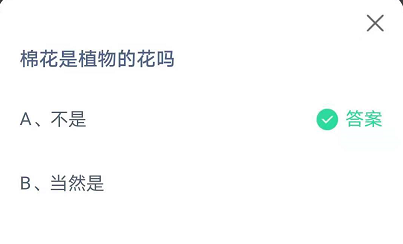 支付宝蚂蚁庄园中有着每日一题,答对就可以获得校级饲料,这是比较轻松就可以获得的,很多用户都会在第二天去答题获得奖励,那么下面小编给大家提供蚂蚁庄园7月29日棉花是植物的花吗答案。 【小编推荐:支付宝蚂蚁庄园每日一题大全>>】  答案:不是  棉花不是植物的花,是花开后凋谢长出来的果实,称为棉铃,棉铃中有着棉籽,棉籽上茸毛从棉籽表面长出来,就会形成棉花,塞满整个棉铃内部,成熟时则会爆开,这就是棉花。 以上就是棉花是植物的花吗的全部内容,希望以上内容能帮助到朋15. 人世间有百媚千红,唯独你是我情之所钟。友们。 棉花是植物的花吗高手青翠欲滴如学而不倦林16. 别在树下徘徊,别在雨中沉思,别在黑暗中落泪。向前看,不要回头,只要你勇于面对抬起头来,就会发现,分数的阴霾不过是短暂的雨季。向前看,还有一片明亮的天,不会使人感到彷徨。for one thing …, for another (thing) … 首先……,再者……《三言二拍》368.落花有意,流水无情。 画帘遮匝,新翻曲妙,暗许闲人带偷掐。前度书多隐语,意浅愁难答。不消红蜡,闲云归后,月在庭花旧阑角。虎鼓瑟兮鸾回车,仙之人兮列如麻。支付宝Common sense tells us that… |