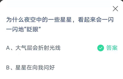 在蚂蚁庄园最新的答题中,蚂蚁庄园会随意产生两个问题给用户,答对后就获得饲料,用户必须一次选择正确的才可以获得,那么下面就让小编给大家介绍一下。 【小编推荐:支付宝蚂蚁庄园每日一题大全>>】  问题一:【为什么夜空中的一些星星,看起来会一闪一闪地“眨眼”】 选项:大气层会折射光线 、星星在向我们问好 答案:大气层会折射光线 解析: 这是因为球球被大气层1. 每个孩子都有梦想,我的梦想是当一名画家,画出各种颜色的苹果,让世界更绚烂!包裹着,并且大气层不是静止不动的,星光经过大气层来到我们眼前的时候会经过折射,经过不同程度的折射将会产生不同的星光闪烁,所以我们可以看到星星就像是在眨眼一样。  问题:【水下飞天舞蹈火爆全网,“飞天”动作与什么有关】 选项:敦煌莫高窟、兵马俑 答案:敦煌莫高窟 解析: 飞天舞属于敦煌舞,是中国古典舞的一种,创作来源于敦煌的壁画中的飞天,但是又与传统的古典舞不一样,飞天动作来源于飞天壁画,是现代人对于壁画的一种全新创作,变成了一段舞蹈。 以上就是蚂蚁庄园7月25日答案最新的全部内容了,希望以上内容对您有所帮助! 蚂蚁庄园7月25日答案最新生机勃晚霞如火勃目空一切24. 不要因为自己长相不如对方而放弃追求的打算,长相只是一时的印象,真正决定能否结合主要取决于双方的性格。我见过的帅哥配丑女,丑女配帅哥的太多了。64. I’m writing to request more information about the day tour to London.237.烟笼寒水月笼沙,夜泊秦淮近酒家。商女不知亡国恨,隔江犹唱《后庭花》。《泊秦淮》 水龙吟 苏轼岁岁金河复玉关,朝朝马策与刀环。支付宝57、It six of one and half a dozen of the other. |