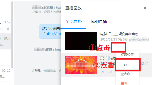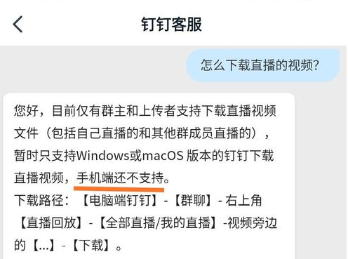 钉钉群直播功能的推出为企业员工的日常交流带来了方便,如果你没有来得及观看群直播,可以选择回放直播视频,当然了,你也可以请别人帮忙下载直播视频。如何下载钉钉群直播视频?请看文章说明。 钉钉群直播视频怎么下载? 在电脑桌面上双击 钉钉 快捷方式,打开软件,登录账号,如图,在左侧菜单栏点击“消息”,找到任意一个群聊,  点击进入群聊窗口,然后点击右上角的“直播回放”按钮,如图所示,  找到需要下载的直播视频,点击“...”,出现下拉菜单,选择“下载”,  弹出对话可,选择视频保存的位置,设置文件名,点击“寸积铢累拼音:cùn jī zhū lěi释义:点点滴滴地积累。出处:明·朱国祯《涌幢小品》寸积铢累,崇圣遗墟及郡中坛宇,焕然一新。”示例:无保存”即可,  下载完成,即可在桌面看到视频文件,下载的直播视频一般默认是 MP4 格式。  注意:目前仅支持钉钉电脑版下载直播视频,另外,如果你不是钉钉群主或者主播,即无法下载群直播视频,需要联系他们进行帮忙。  想了解更多精彩教程资讯,请关注 完美下载 。 延伸阅读| <上一篇 | 相关软件 | 下一篇> | | 钉钉上提交申请加班的图文步骤 | 阿里钉钉电脑版 v5.0.6.1 官方版 | 钉钉办公软件中修改文件名的方法 | -