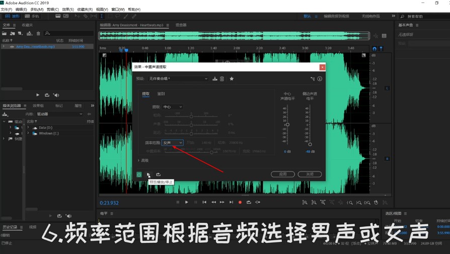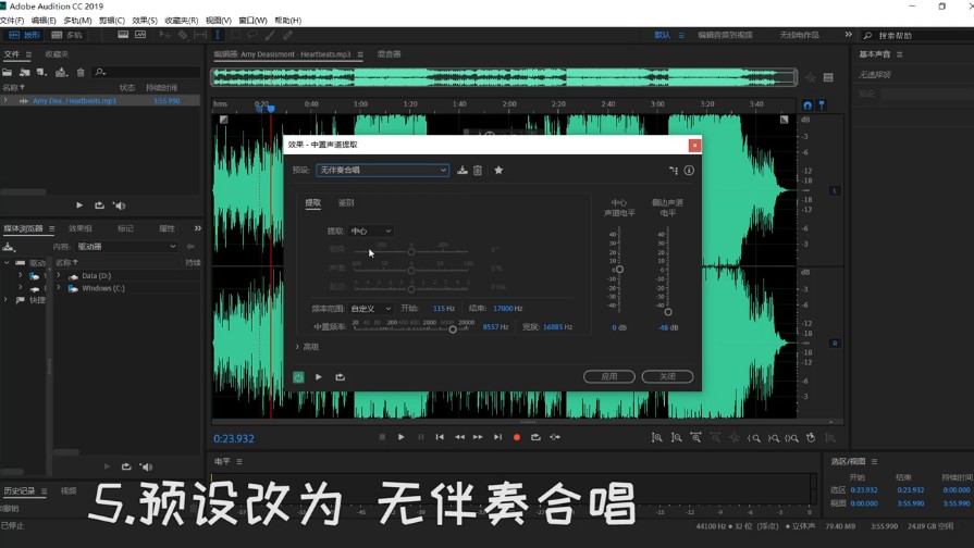 Adobe Audition 是一款非常专业的音频处理软件,支持音频剪辑、音频合并、录音等功能,当然了,AU 还可以从音频中快速提取人声。如何提取音频中的人声?下面请看文章详细说明。 Adobe Audition 如何提取音频中的人声? 打开 Adobe Audition 软件,进入界面,导入一段音乐,  音频文件导入成功,将其拖入编辑区并试听,  在上方菜单栏点击“效果” -> “立体声声像” -> “中置声道提取器”,如图所示16. 失恋不失志。失恋后决不萎靡不振,失去对事业追求的志向和信心。,  弹出窗口,点击“预设”,修改为无伴奏合唱,  设置“频率范围”,根据音频选择男声或女声,点击“应用”,AU 软件即会自行处理,耐心等待,  处理完成,点击试听效果,最后关闭软件。  了解更多精彩教程资讯,关注 完美下载 。 -