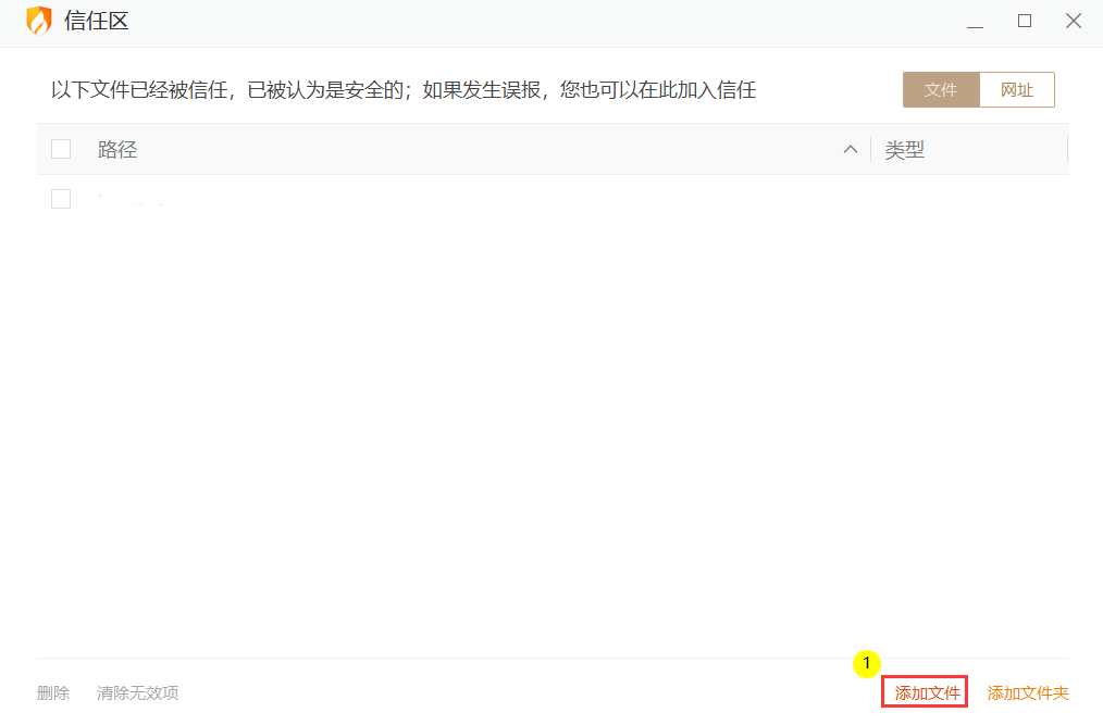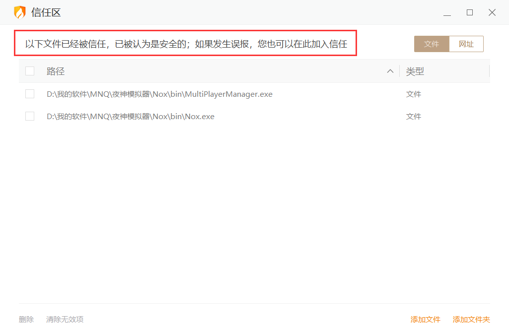 步骤 2. 对于不想退出火绒的用户,可以选择添加信任区白名单。点击进入信任区->添加文件->找到模拟器安装目录下的 Nox/bin 文件夹,将 Nox.exe(夜神模拟器)和 Multi Player Manager(夜神多开器)文件加入白名单即可