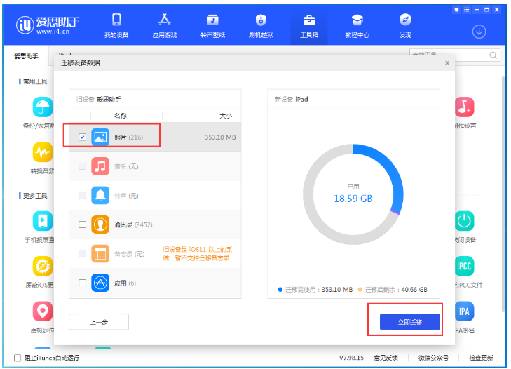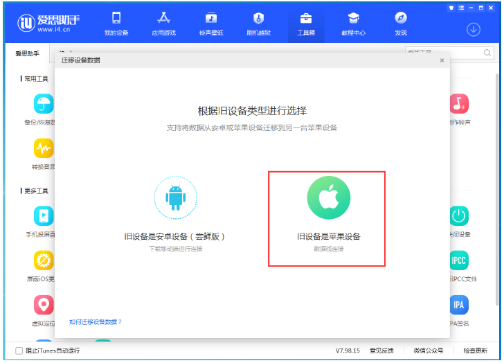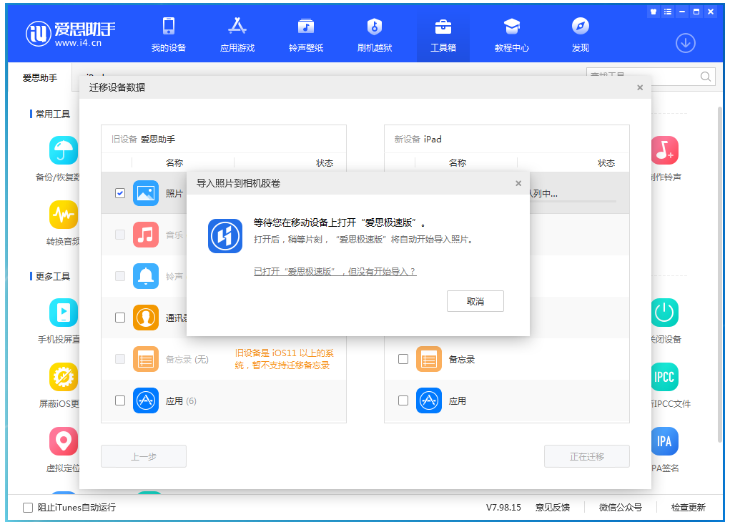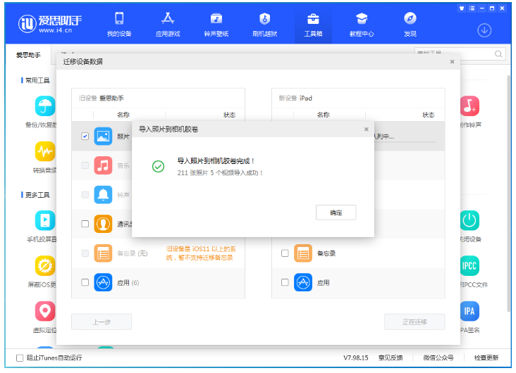 现在大多数安卓手机提供了类似“一键换机”的功能,帮助用户解决了在新旧设备中迁移数据的麻烦,那么问题来了, iPhone 手机如何进行数据传输? iPhone 用户如何在新旧设备中传输照片?今天小编就来支招,让大家通过爱思助手实现照片快传。 爱思助手如何在两台 iOS 设备中传输照片? 先将两台iOS设备通过数据线连接到电脑,在电脑中打开爱思助手,进入界面,如图,点击“工具箱” ->“迁移设备数据”,选择旧设备类型,点击“旧设备是苹果设备”,   如图,软件会自动识别两个设备,点击“切换”,可以调整新、旧设备顺序,然后点击进行下一步,  勾选“照片”选项,点击“立即迁移”,中途不要断开数据线连接,等存十一于千百拼音:cún shí yī yú qiān bǎi释义:指亡多而存少。出处:语出晋·陆机《叹逝赋》顾旧要于遗存,得十一于千百。”示例:而今学者尚知宗孔氏、崇仁义、贵王贱霸而已,其大经大法皆亡灭而不救、坏烂而不收,所谓~,安在其能廓如也!★唐·韩愈《与孟尚书书》待迁移结束,  照片转移时需要在新设备中打开 “照片处理工具”,打开后稍等片刻,将会自动导入照片,数据传输完成,点击确定即可。   总结:一般情况下,很多人会采用隔空投送或者iCloud共享相册的方法在新旧 iPhone 中传输照片,大家也可以试一试。了解更多精彩教程资讯,关注完美下载。 -