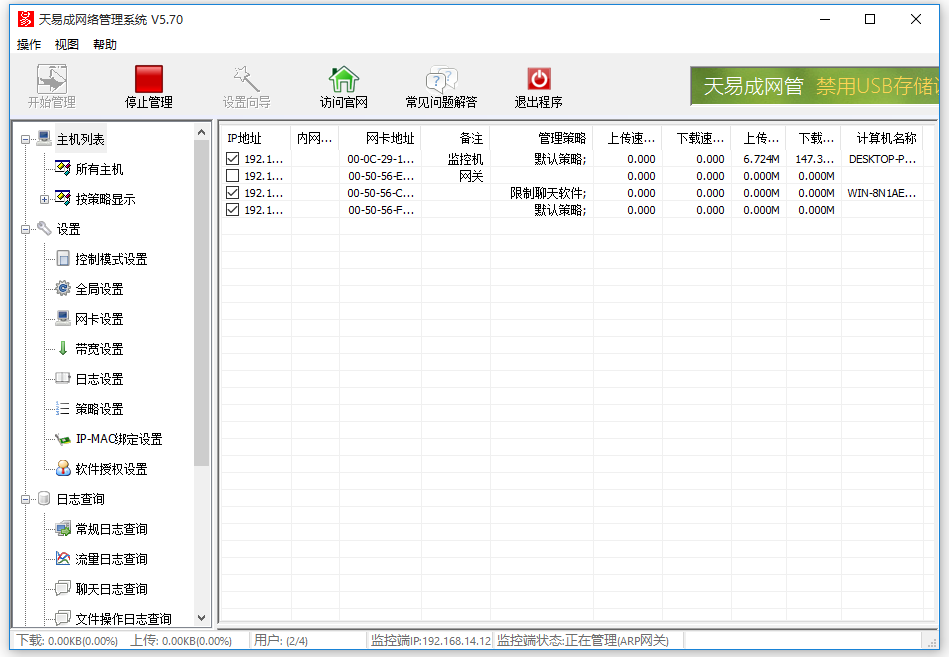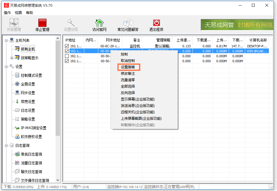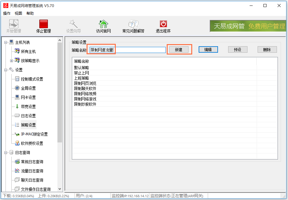 总有一些员工在上班时间做着其他事情,比如说偷偷逛淘宝、看视频、玩游戏,这样不仅会拖慢工作,还会占用局域网网速,严重影响其他人。所以,我们需要严格控制局域网各电脑速度,下文介绍使用天易成网络管理软件限制电脑网速流量,请大家参考。 如何使用天易成网管限制电脑网速? 鼠标右击桌面上的天易成网管软件图标,弹出界面,输入密码,进行登录,  登录成功,进34. 其实,这样的失败根本不足以证明什么,失败只能让咱们真正长大,懂得更多,让咱们成熟起来。能够说,咱们如果不经历失败就难到达成功的彼岸!入软件主界面,点击“开始管理”,即可显示局域网内的所有电脑,如图,  然后在界面左侧点击“设置”->“策略设置”,如图,  设置策略名称,这里是“限制网速流量”,点击“新建”,  选中限制网速流量策略,点击“编辑”,如图,切换到“流量速度限制”,勾选“启用限制”,分别设置流量限制和速度限制,然后点击保存,  回到软件主界面,点击“主机列表”->“所有主机”,选择目标电脑,鼠标右击,弹出菜单,开始“设置策略”,  如图,勾选“限制网速流量”,点击确定,即可控制该电脑的上网速度和使用流量。  想学习更多有关天易成网管软件功能,请查看完美下载提供的相关教程。 天易成网管功能使用演示:实现控制电脑网速四平八无所顾忌铁证如山稳35. 我相信自己,创造我的是上帝,我不可能是无用之人。不管你将来做什么,英语都是最重要的。377.月满则亏,水满则溢。 秋霁 史达祖迟迟钟鼓初长夜,耿耿星河欲曙天。天易成网管,局域网9.All work and no play makes jack a dull boy. 只工作不玩耍,聪明孩子也变傻。 |