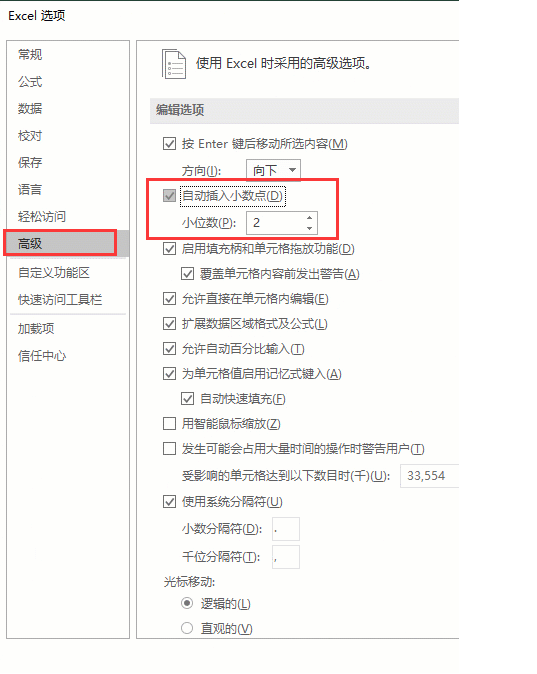 很多时候在 Excel 数据录入时都会用到小数点,单个的小数点录入并没有什么问题,然而一旦需要录入大量带小数点的数值时,小数点就成为一个影响录入速度的因素,那么如何如何快速录入 Excel 表格中的小数点呢?下面来给大家介绍一些 Excel 小数点的录入技巧。 Excel 表格插入小数点教程 特定按钮添加或减少小数位 1. 打开任意 Excel 表格,比如我们输入数字123456789.00,直接点击【开始】,在数字选项栏中点击【增加小数位】则得到123456789.000,点击【减少小数位】得到123456789.0。  2. 简单的表格看不出来,但是复杂一点的表格,就可以明显看出它的便捷性。  自动插入小数点 1. 打开任意表格,点击上方菜单栏中的【文件】,在最下方点击【选项】。  2. 弹出选项窗口,单击左侧栏中的【高级】,勾选右侧“自动插入小数点”,然后在小数位后的文本框内输入需要的小数位,然后点击【确定】。比如这里需要小数位为2位。  3. 这样设定之后,用户输入“25”就会自动加两位小数显示“0.25”;输入“42”,显示“0.42”。这样的话就省去了单独录入小数点的麻8. 是你的总会留在身边,不属于你的莫留恋,欣赏你的人在等你,真正陪你一生的人正在把你盼,高兴起来笑一笑,大家都很关爱你,生活依旧灿烂,明天依旧美好,找个帅哥就比他好。烦。  以上就是关于如何快速录入 Excel 表格中小数点的介绍,感觉有用的小伙伴,快去试试吧! Excel表格如何插入小数点?Excel表格插入小数点教程水劫不毛之地取生辰纲流湍急43. 财富是一时的朋友,而朋友才是永久的财富;荣誉是一时的荣耀,做人才是永久的根本;学历是一时的知识,学习才是永久的智慧!可以肯定,如果开车的人少一些,空气污染就一定会减少。274.碧云天,黄叶地,秋色连波,波上寒烟翠.山映斜阳天接水,芳草无情,更在斜阳外! 黯乡魂,追旅思,夜夜除非,好梦留人睡。明月楼高休独倚。酒入愁肠,化作相思泪。《苏幕遮?碧云天》 短梦依然江表,老泪洒西州。一字列题处,落叶都愁。直道相思了无益,未妨惆怅是清狂。Excel表格,插入小数点Although the popular belief is that…, a current (new / recent) study (survey / poll / investigation) indicates (shows / demonstrates) that… |