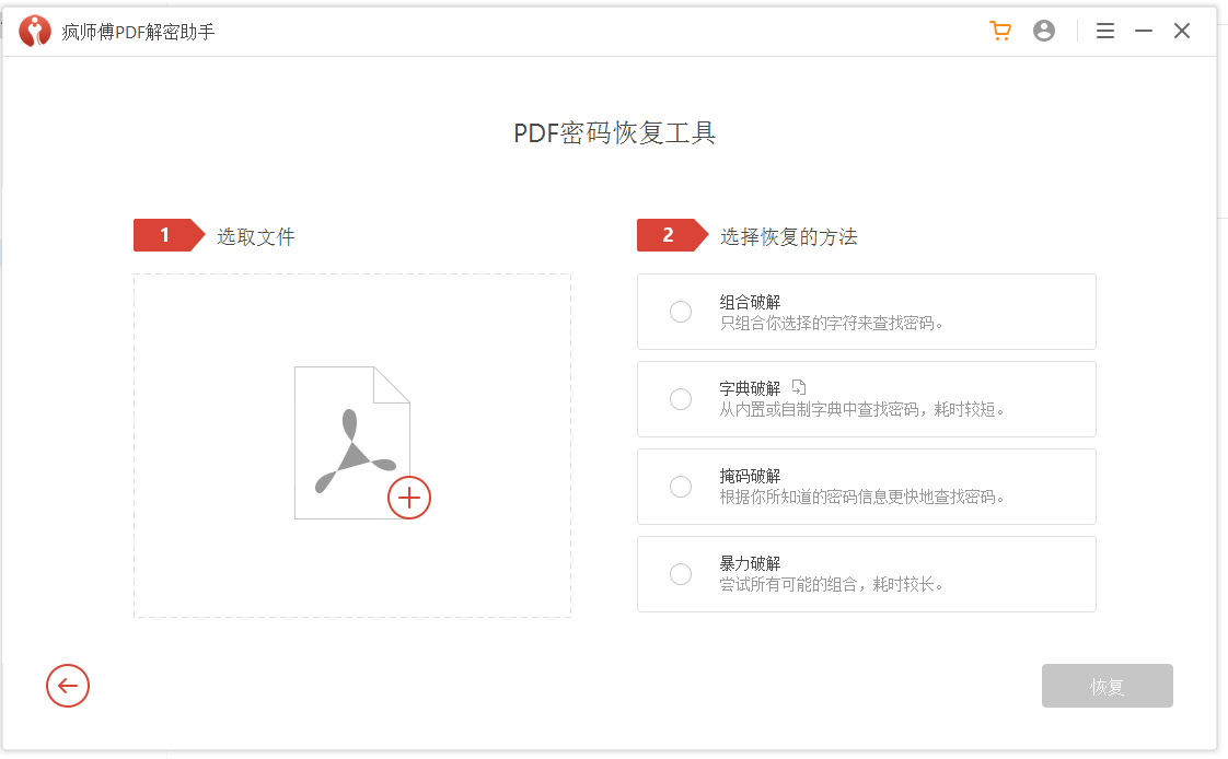为了保护 PDF 文件安全,我们可以设置加密,如果密码过于复杂,时间一长,可能会忘记密码,怎么办呢?这时需要借助专业软件进行解密,例如疯师傅 PDF 解密助手,一听名字就能知道软件作用,它可以轻松恢复 PDF 文件密码,成功率较高。 如何正确破解 PDF 文件密码? 1. 从本站下载安装 疯师傅 PDF 解密助手 ,打开软件,进入界面,如图,这里有两个选项,点击“恢复密码”,  2. 进入新界面,如图,点击加号,导入需要破解密码的 PDF 文件,然后选择一种密码破解方式,小编选的是“组合破解”,然后进行下一步,   疯师傅 PDF 解密助手提供了四种密码破解方式,包括“组合破解”、“字典破解 ”、“掩码破解”、“暴力破解”,每种方式适应的情况不同。 3. 完成上述操作,点击“恢复”,软件即可自动解密,耐心等待;成功恢复密码,你可以点击“复制”,直接解锁 PDF 文件。  注意:软件试用版本无法移除 PDF 密码,你必须付费购买软件才能获得所有权限。想了解更多精彩寸利必得拼音:cùn lì bì dé释义:寸利微小的利益。微小的利益也必须得到,不能放弃。形容斤斤计较个人的得失。出处:无示例:无教程资讯,记得关注 完美下载 。 -