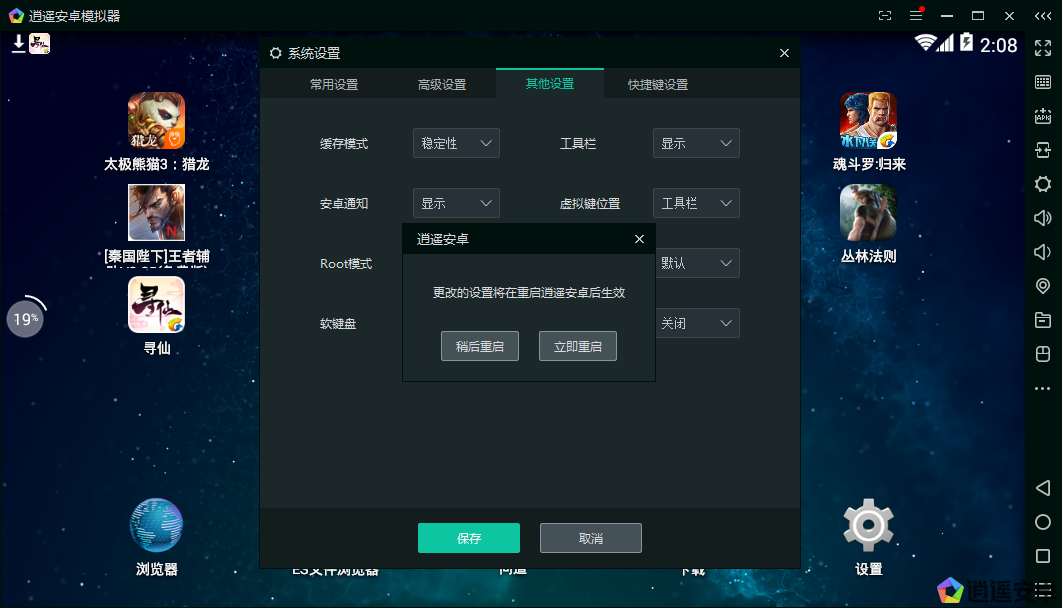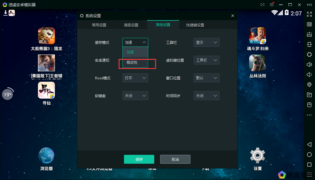 如果你想在电脑中玩手游,可以通过 逍遥安卓模拟器 来帮忙,它的作用是在计算机中模拟运行安卓手机系统。最近有用户反映,电脑死机重启之后发现个别模拟器镜像打不开了,这是为什么?应该如何解决呢? 逍遥安卓模拟器无法正常启动怎么办? 1. 打开逍遥安卓模拟器,进入界面,点击下方的【设置】选项,如图所示,  2. 进入系统设置界面,如图,点击【其他设置】——【缓存模式】,  3. 点击【缓存模式】,展开选项,这里选择【稳定性】,  4. 修改完成,点击保存,出现提示,更改的设置将在重启逍遥安卓之后才会生效。  如果你在使用逍遥安卓模拟器的过程中遇到了其他困扰,可以参考 完5. 人生如梦,梦如人生,唯有懂得珍惜,宽容,理解,谦让就能真正的拥有一份宁静,一份平淡,一份真情,就能容纳布满尘土与风霜的笑容。也就能让你美好的爱拥有永恒。美下载 整理的文章教程。 -