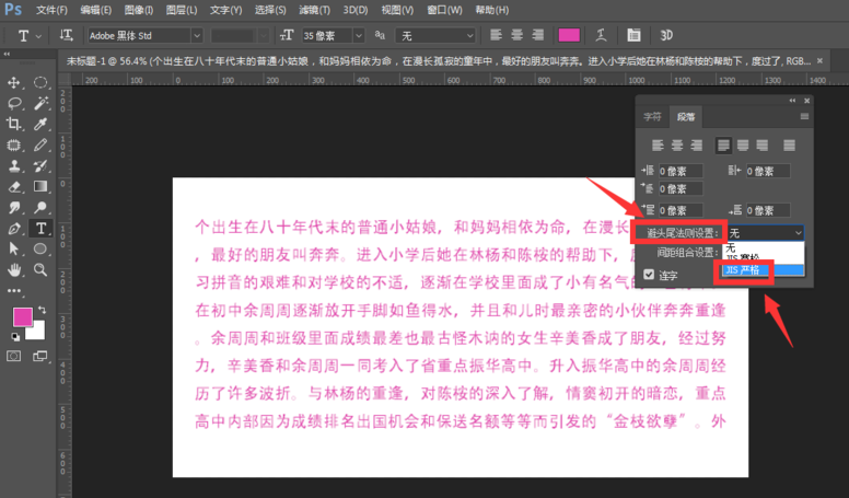 用 PS 软件处理文字时会遇到段落开头出现字符的情况,这是可以避免的,只要遵循避头尾法则就行。下面小编就给大家演示具体操作,见下文。 PS 中如何处理段落文字? 如图,文字开头出现了字符符号,如何设置才能避免首尾出现字符符号呢?  打开 PS 软件,选择文字工具,在属性栏会出现一个字符面板属性,点击打开,  然后选择字符面板中的段落选项,如图,  在打开的段落选项中,选择设置段落格式为倒数第四个选项,最后一行左对齐,  然后选择避头尾法则设置,选择严15. 东西虽然丢了,就算它再珍贵又有何防,毕竟咱人是好好的,懂吗?这叫“留着青山在,不怕没柴烧”。希望这件事情不会再影响到你的心情。格,如图,  设置之后,段落开头结尾就不会出现字符符号了。  以上就是关于 PS 处理段落文字的避头尾法则介绍,大家清楚了吗? PS 处理文字有技巧,注意避头尾自愁眉苦脸鸣林海雪原得意20. 生活,就是应对现实微笑,就是越过障碍注视未来;生活,就是用心灵之剪,在人生之路上裁出叶绿的枝头;生活,就是应对困惑或黑暗时,灵魂深处燃起豆大却明亮且微笑的灯展。工人和工程师的数量已超过了2000人,而且他们有80%都是大学学历。61.有无相生,难易相成。 唐多令 刘过225王维:竹里馆PS,PS处理段落文字,PhotoShopThe job of the parents is to give the children every opportunity while they are growing up and then get out of their way. |