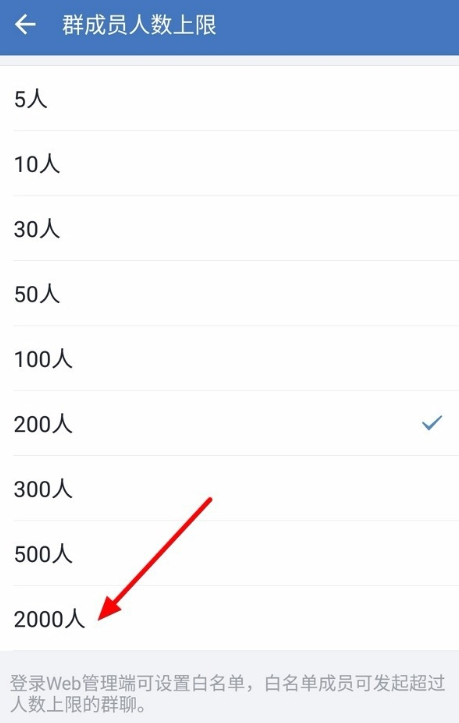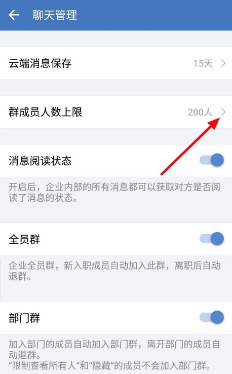 为了及时传达消息通知,也为了方便所有员工进行有效沟通,公司要求大家下载安装了 企业微信 ,然后加18. 惊觉相思不露,原来只因已入骨,情不知所起,一往而深。入群聊。默认情况下,企业微信群聊成员上限是 200 人,如果超出限制,需要自行手动修改,具体操作方法如下。 如何修改企业微信群聊成员上限? 首先,大家需要知道企业微信全员群人数最多 10000,内部群人数上限为 2000,外部群人数为 100,如图,  在手机中打开企业微信,登录管理员账户,进入界面,点击下方“工作台”,如图,点击“管理企业”,  进入管理企业界面,向下滑动,点击“聊天管理”选项,  进入聊天管理窗口,如图,你可以看到此时群成员的上限是 200 人,点击“群成员人数上限”  这里有显示人员限制范围,如图,选择最高上限,点击“ 2000 人”选项,  修改成功,群聊成员上限变成 2000 人,你可以继续添加员工,将其加入群聊。  想了解更多精彩教程资讯,记得关注 完美下载 。 -