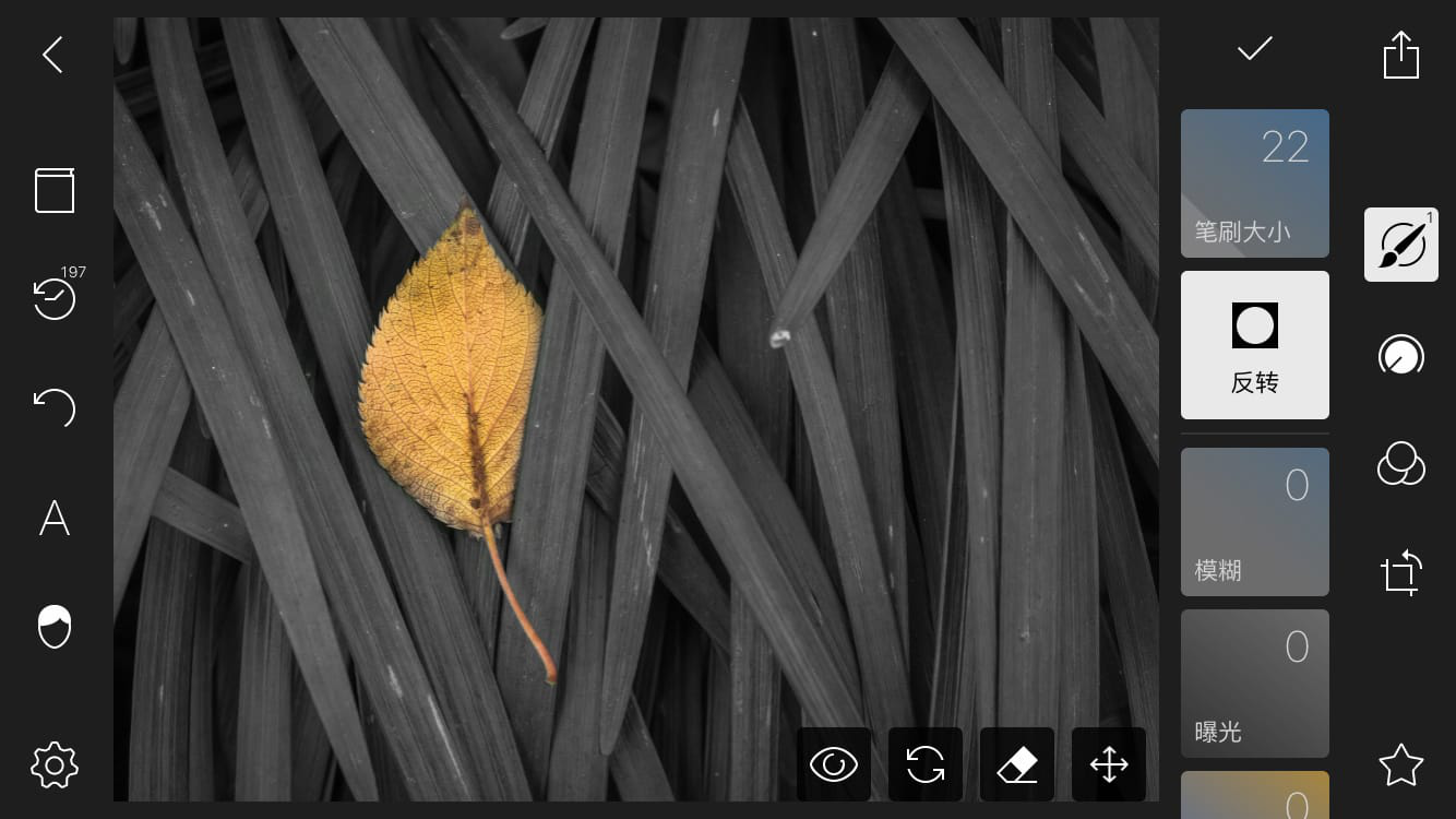在用泼辣修图对图片进行处理时,杯盘狼藉拼音:bēi pán láng jí释义:狼藉象狼窝里的草那样散乱。杯子盘子乱七八糟地放着。形容吃喝以后桌面杂乱的样子。出处:《史记·滑稽列传》日暮酒阑,合尊促坐,男女同席,履舄交错,杯盘狠藉。”示例:这桌子微醺,那桌子半酣,~,言语喧哗。★清·李绿园《歧路灯》第八十八回有时我们为凸显图片中某一部分从而强调我们想要表达的主体,就需要用到局部换色这一操作。所谓局部换色就是使图片只有局部存在色彩信息,从而与其他部分形成反差,那么如何来做呢?下面我们就来介绍局部换色的三种方法。 泼辣修图如何进行图片局部换色? 为了便于比较三种方法的优劣,我们都以树叶和草的图片为例进行局部换色操作,达到效果为保留树叶的颜色,去掉草的颜色。  一、HSL工具调整法 这种方法的特点是操作简单,但由于只能做全局调整,因此只适用于色彩分明的场景,如果照片景物颜色相近就无法使用了。 1. 打开 泼辣修图 ,导入图片,点击【调整】,找到【HSL工具】。  2. 选中【绿色】和【青色】(草的颜色),将它们的饱和度数值降至最低,这样草就会呈现黑白效果。  二、选色工具调整法 这种方法优点是可以对局部进行精确的色彩调整,缺点是无法区分同类色彩,适用范围和HSL工具调整法一致。 1. 导入图片,点击【局部调整】,选中选色工具。  2. 这时【曝光】数值会默认提高到+50,同时图片会出现内外两个圆圈。把内圈放在草上面,就会选取与草的颜色相似的颜色区域(也就是绿色),调整参数时只会影响选取的颜色区域(也就是草的颜色),调整范围是外圈以内的区域。  3. 拖动外圈,使其覆盖所有草地,然后将【饱和度】调至最低。可以看到草的饱和度降低了,但是树叶的色彩没有受到影响。  4. 有时单纯一个选色无法达到理想效果,用户可以根据需要多创建几个选色进行调整,方法相同。  5. 另外降低【曝光】数值,也可以使树叶更加明显。  三、笔刷调整法 这种方法优点在于精确化和自定义程度高适用于所有场景,缺点是操作相对复杂。 1. 导入图片,点击【局部调整】,然后选择【笔刷】。  2. 调整笔刷大小将图片中需要凸显的部分(树叶)选中。  3. 点击【反转】,这样就选中了树叶以外的区域,点击【饱和度】数值降低至最低,除树叶以外的区域呈现黑白效果。  4. 点击【曝光】,将其数值降低至-60(其他数值也可以)这样树叶效果就会更加突出。  以上就是关于使用泼辣修图三种局部换色方法的介绍。通过本次教学,我们清楚的明白笔刷调整法的优势,希望大家下去之后认真练习掌握! 泼辣修图如何修改图片局部颜色?泼辣修图调色技巧坚舍死忘生九牛一毛强不屈29. 走过每一个季节交替的边缘,逝去的是过眼云烟,留下的是情事依然,记忆徜徉。不管是来世今生,还是君不来我一如既往守候,这一轮回,我只想用文字来铺垫一条叫岁月的长河,此端彼岸,两两相望。很荣幸给你介绍我的一位好朋友,刘翔。333.落花人独立,微雨燕双飞。晏几道《临江仙》 竟日微吟长短句,帘影灯昏,心寄胡琴语。数点雨声风约住,朦胧淡月云来去。射杀山中白额虎,肯数邺下黄须儿!泼辣修图,修图,泼辣修图技巧45、Use legs and have legs. |