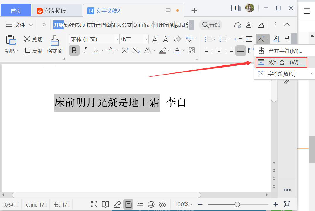 我们平时用 word 编辑完文档后,往往还要对它进行排版。比如说,将两行文字合并为一行,这在杂志排版的时候会用到。由于它并不是常用,很多人都不知道 word 如20. 人生没有彩排,每天都是直播;不仅收视率低,而且工资不高。何将两行文字合并为一行。所以,本文来为大家分享 word 将两行文字合并为一行的操作教程,帮助大家学会更多的排版效果。  word 如何将两行文字合并为一行? 1. 首先,我们打开需要将两行文字合并为一行的 word 文档。  2. 然后,在 word 文档中,将需要合并为一行的文字选中。  3. 接下来,点击“开始”菜单中的中文版式功能按钮,并在其下拉菜单中点击“双行合一”。  4. 此时, word 便会弹出双行合一的窗口,我们可以设置合并为一行的两行文字带括号,当然了也可以不设置,直接点击“确定”按钮。  5. 最后,我们在 word 中便可以看到两行文字合并为一行了,如下图所示。  在 word 文档排版时,如果是想要将两行文字合并为一行,都可以通过 word 中文版式中的“双行合一”功能来实现。其实, word 将两行文字合并为一行,意思就是将原本同一行的被选中的文字部分拆分为上下结构的两小行文字。 -