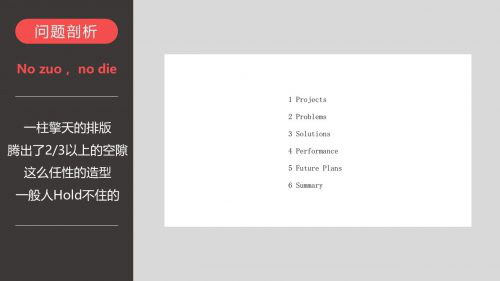 | 内容 | 时常听到好多小伙伴说自己做的 PPT 太丑,不能够吸引人,那么 PPT 怎么做的高大上呢?需要一些小技巧。普通的 PPT 毫无吸引力,也就等于白做了,下面小编准备了一些制作 PPT 的巧妙方法,可以让你的 PPT 瞬间变得高大上,避免做的呆板或空洞无力。 ![]() PPT 怎么做的高大上? ![]() 未经排版和版面元素过少,是造成 PPT 空洞的直接原因。 而更加深刻的原因在于: PPT 本身无法带给观众厚重感、充实感和刺激感。 ![]() 厚重感: 指 PPT 整体感觉上,呈现出一种充沛的力量,并且令人感觉到稳重。 充实感: 指 PPT 版面布局中,元素基本能够占据大部分版面,不会出现大块空白。 刺激感: 指 PPT 能够让人眼前一亮,激发观众继续阅读下去的兴趣。 ![]() 获取厚重感——颜色视角 深色相对于浅色,会更有力量、更加稳重,所以为了消除空洞感,宜采用深色背景;而亮色比暗色鲜活,可以避免让 PPT 一不小心患上"老年痴呆症"。 获取充实感——布局视角 有两类方法,包括:不增加新元素(对已有元素进行形状放大、间距扩大和调整版式),以及增加新元素(添加辅助文字)。 在调整版式时,采用居中、交错、横向的版式,会有利于加强版面元素对版面的驾驭力。 在增加新元素时,是对已有内容进行进一步阐述说明(如内容梗概、重点分析等),或者加入一些相关的特征信息(比如,时间、作者、企业 logo、进度条等)——说白了,就是想尽一切办法往 PPT 里加东西。 获取刺激感——装饰视角 包括三种装饰方法:添加色块、线条、边框。其实,这是为了加强对比,增强视觉冲击力。 利用前文介绍到的方法,下面将会以一个国际房地产项目的工作汇报 PPT 为案例,进行修改,通过简单几步,去拯救一个不小心落入「空洞派」手里的"失足 PPT "。 1.1 封面页 修改前: ![]() 修改后: ![]() 布局扩充 对主标题文字进行巨大化处理,让文字占据版面1/2左右的比例,字体改为微软雅黑并加粗——瞬间有种美队从"弱鸡"变身"肌肉男"的赶脚。 辅助文字 包括时间、演讲人、绩效提高 90% 的信息(小心机,向老板强调你的出色业绩),用"文字后宫群"进一步扩大文字区域的势力范围。此外,这些"千娇百媚"又"娇小可人"的辅助文字,它们与巨大的主标题形成鲜明对比,有很好的装饰作用。 装饰手法 为整个文字块外侧垂涎三尺拼音:chuí xián sān chǐ释义:涎口水。口水挂下三尺长。形容极其贪婪的样子。也形容非常眼热。出处:老舍《赵子曰》第三章对面坐着一个垂涎三尺的小黑白花狗,挤眉弄眼的希望吃些白薯须子和皮。”示例:无添加一个艺术范的边框(辣么,要肿么样的边框才会好看呢?哥/姐们,那就真的,只能靠你们自己的审美水平啦)、添加精致小图标,以及将主标题文字填充华丽丽的红色。 (当然还有换了个美美哒背景,不过这个是如此之明显,在此就不再赘述,后文也不再赘述、不再赘述、不再赘述……) 1.2 目录页 改进前: ![]() 修改后: ![]() 布局扩充 一方面,由"一柱擎天"的布局转化为横向布局,并扩大文字横向间距——这样可以拓展文字区域横向空间;另一方面,添加上下横线,进一步拓展了文字区域纵向空间。 辅助文字 顶部的目录题目和内容简介,其实完全是可有可无的啦~不过,为了让文字区域形式更加多样化,对于内容简介,就算把脑洞挖穿也要想出来哟。 装饰手法 主要体现在两种处理手法,首先是线条的装饰,直线对区域的划分,圆框对序号的强调;其次是颜色的对比,对目录、内容简介标题、6 章标题中的第 3 个标题进行颜色强调。 1.3 图文页 修改前: ![]() 修改后: ![]() 布局扩充 采用上下错位的布局方式,并把图片从"矮肥胖"裁剪为"瘦高个",让图片对版面的占用率得到提高——其实,一般排版是不需要如此大费周折的,为了应对治愈 PPT "空洞症",有时候的确需要"不择手段"一下~ 辅助文字 对图片进行简单介绍,说明每张图片的涵义,帮助读者更好地理解;同时也减少了:由于交错布局所带来的不整齐感。 装饰手法 加入亮色引导号、图片标题采用对比色、并为主标题右侧加入辅助文字(这个辅助文字难道不是很多余吗?没错!但只要美就行啦,谁会 care 它多不多余呢?) 1.4 正文页 修改前: ![]() 修改后: ![]() 布局扩充 第一招"放大"。管他三七二十一,对于版面元素少的情况,放大文字,扩大文字行距是必须的措施。第二招"居中"。居中没有为主体元素添加任何东西,它作用的对象是留白区域,让大块的留白看起来自然而协调。 辅助文字 & 装饰手法 在这一部分,它们俩是共同发挥作用的——构成一个包围整个版面的虚拟边框。 该方法堪称"解决版面空洞问题的终极绝招"!因为只要加了这样一个东西,即使版面主体内容极少,也完全不会有任何违和感(可自行尝试)。 啰嗦一下,虚拟边框一般由:企业 logo /名字、进度条(文字形式和图形形式)、装饰线组成。 好了,对案例的修改已经全部完成,让我们看一下改进前后的对比: ![]() ![]() 以上就是" PPT 怎么做的高大上?制作 PPT 的几个小技巧介绍"的相关内容,希望对大家有所帮助。 PPT怎么做的高大上?制作PPT的几个小技巧介绍竹丰富多彩篱瓦舍蜻蜓点水5. 言语的伤害是最大的伤害,因为皮肉的伤害能够很快愈合,但是一旦心灵被伤害了,要愈合就困难得多。这世界上最残忍的事,就是抓住对方的过错进行指责,而不给别人宽容和机会。一个高尚的人,往往更能为别人思考,善于控制自己的情感,在任