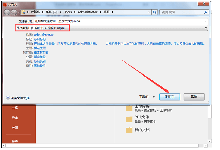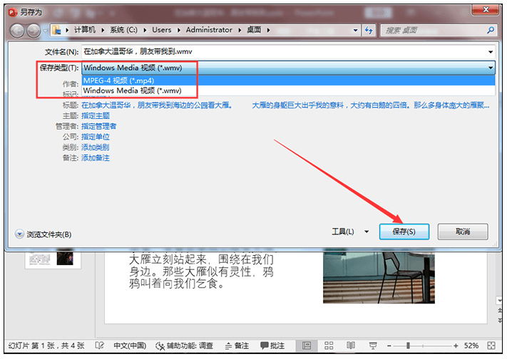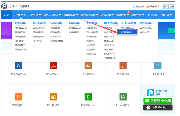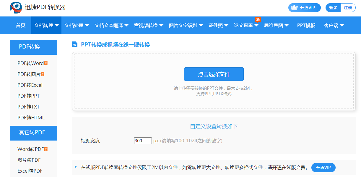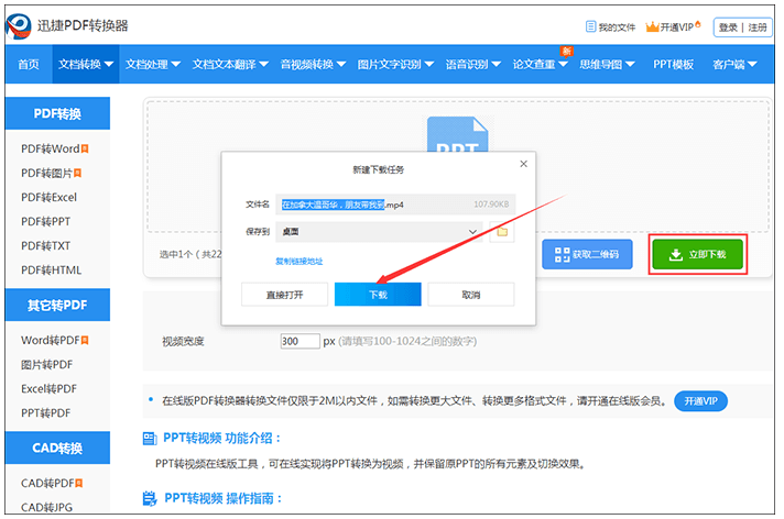 日常办公,领导要求将 PPT 文件内容通过视频的形式进行呈现,与其重新整理材料制作视频,大家可以直接把 PPT 文件转成视频。如何将 PPT 文件转换成视频?本文介绍了三种方法,大家可以学习参考。 如何将 PPT 文件转换成视频? 方法 1. 导出为视频文件 打开 PPT 文件(本教程中使用的是 PowerPoint 2016),如图,在上方菜单栏中点击"文件"——"导出",选择"创建视频"——"创建视频",  弹出"另存为"对话框,点击"保存类型",选择“mp 4”或者“wmv”视频格式,然后点击"保存",即可将 PPT 文件转换成视频。  方法 2. 另存为视频格式 打开 PPT 文件(本教程中使用的是 PowerPoint 2016),在菜单栏中点击"文件"——"另存为",然后依次点击"这台电脑"&mdas39. 一阵风一辈子只为一棵树而停下脚步;一朵云一辈子只为一片土地而化成雨滴;我愿做你的风,你的云!而你永远是我心中最最重要的那亩田!h;—"桌面",  弹出另存为对话框,点击"保存类型",选择视频文件格式,然后点击保存,即可将 PPT 转换成视频。  方法 3. 在线转换 除了以上两种方法之外,大家还可以通过网站平台进行在线转换,例如迅捷PDF转换器,点击进入迅捷 PDF 转换器逛网,如图,点击"文档转换"——"OFFICE 转换"——"PPT 转视频"功能,  进入以下界面,点击导入 PPT 文件,文件添加完成即可转换,注意,如果你没有注册开通会员,只能处理体积为 2M 的文件,  转换完成,点击"获取二维码"或者"立即下载",保存视频文件。  了解更多精彩教程资讯,关注完美下载。 -