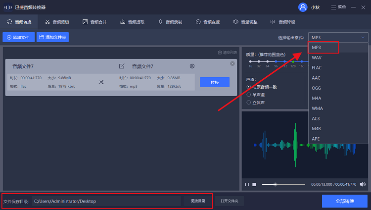 QQ 音乐 播放器是大家非常喜欢的一款听歌软件,如果你有需要,可以随时下载自己喜欢的歌曲。当然了,QQ 音乐支持的歌曲格式有 APE、FLAC 等,为了便于播放,大家可以将歌曲文件转换为 MP3 格式,具体操作请看文章说明。 如何将QQ音乐歌曲文件转换成MP3格式? 方法 1. 大家可以在下载 QQ 音乐歌曲之前进行设置,使得下载的音乐文件为 MP3 格式。打开 QQ 音乐播放器,在搜索框中输入需要下载歌曲,得出结果,然后使用鼠标点击上方的主菜单图标,弹出选项,选择"设置",  进入设置界面,如图,点击"下载与缓存",你可以调整下载目录,勾选相关选项,然后返回主界面,  点击下载你喜欢的歌曲,去到目标位置,即可找到下载的 MP3 歌曲。  方法 2. 在电脑中安装迅捷音频转换器,打开软件,进入界面,点击"音频转换"功能,然后点击"添加文件",导入之前下载的 QQ 音乐歌曲;如果音频文件较多,可以选择"添加文件夹",同时上传所有文件,  音频文件添加成功,点击右侧"选择输出格式",选择 MP3 格式,然后自行调整其他设置,设置完成,点击"转换",即可将歌曲文件转换成 MP3 格式。  以上两种方法都可以轻松转换 QQ 音乐歌曲文件格式,欢迎参考。了解更多精彩教程资讯,关注 wmzhe.com。 -