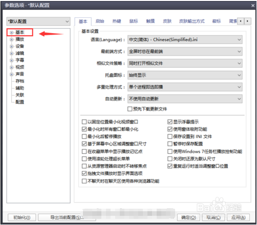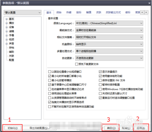 PotPlayer 播放器功能很强大,可以支持所有的音视频格式,不同于普通播放器,PotPlayer 需要更详细的设置。 1. 无论你使用的是安装版还是绿色版,第一次打开 potplayer 播放器你都可以在播放器视频区域右键调出设置菜单或者也可以直接使用快捷键"F5"来打开设置。  2. 在弹出的"参数选项-默认配置"里,你最好先点击左下角的"初始化",然后,依次点击——"应用"——"确定"。关闭选项框。  3. 再次打开 potplayer 播放器设置菜单,我们正式开始设置,首先点击左方框里的"基本",来进行基本设置,基本设置里有许多选项,我们设置的目的就是为了适合自己的使用习惯,建议作如图设置。  4. 点开左方框里的"基本"的扩展菜单,这里我们只需要设置"启始"和"鼠标"两项就好。"启始"是指你打开播放器后,播放器在桌面的位置,一般如图设置。  5. "鼠标"则牵涉到你的使用习惯,一般流行的播放器都是这样的设置,所以你要是不想改变使用习惯的话,建议在设置"鼠标寸步千里拼音:cùn bù qiān lǐ释义:寸步指距离非常短。虽然相距只有寸步,却如同千里之隔。比喻相见非常困难。出处:唐·卢照邻《狱中学骚体》寸步千里兮相闻,思公子兮日将曛。”示例:无"的快捷键的时候,除了前三项,全部都设置成"什么都不做"。  接下来我们点击"播放"进行"播放设置","播放器窗口尺寸"建议使用 1024*576,从屏幕比例上来说,1024*576 、 1280*720 、1920*1080都是 16:9 的比例,你会发现几乎所有的高清资源都是这些尺寸,这样设置就不会因为播放不同片源时重新调整播放器窗口从而造成比例失常,其它如图设置就行。  同样点开左方框里的"播放"的扩展菜单,设置"时间跨度"、"宽高比"、"列表"这几项。"时间跨度"里的"如存在关键帧数据则以关键帧为移动单位"不要勾,勾了的话当你快进时会不按照时间来跳。  "宽高比"和"列表"如图设置就好了,"记忆近期播放名单"和"记忆播放列表的播放位置"都是很实用的功能。   接着是"字幕"设置,不是经常使用外挂字幕的默认设置就好,你也可以使用"使用用户自定义的风格",实际上你设置成"使用字幕中所含风格"也一样可以在"字幕"设置的扩展菜单中对外挂字幕的大小、颜色、字体进行修改。  然后是"声音"里面的"规格化/混响"和"语言/同步/其他"两项。你可以如图设置。  在"规格化/混响"里,如果你打算听到视频资源原汁原味的声音也可以不勾选"仅将规格化拥有视频播放",不过会觉得声音忽大忽小的。  最后是"关联",就是把 potplayer 播放器设置成音视频文件打开的默认程序。  如果你使用的是 win10 64 位系统的话,不建议在这里设置,而是到设置--系统里打开"默认应用"进行设置。 好了,基本设置就完成了,其他的默认就好,现在你的 potplayer 播放器已经可以更加方便的使用了。  以上就是关于 potplayer 的初步使用教程了更多资讯请关注 完美下载 。 -