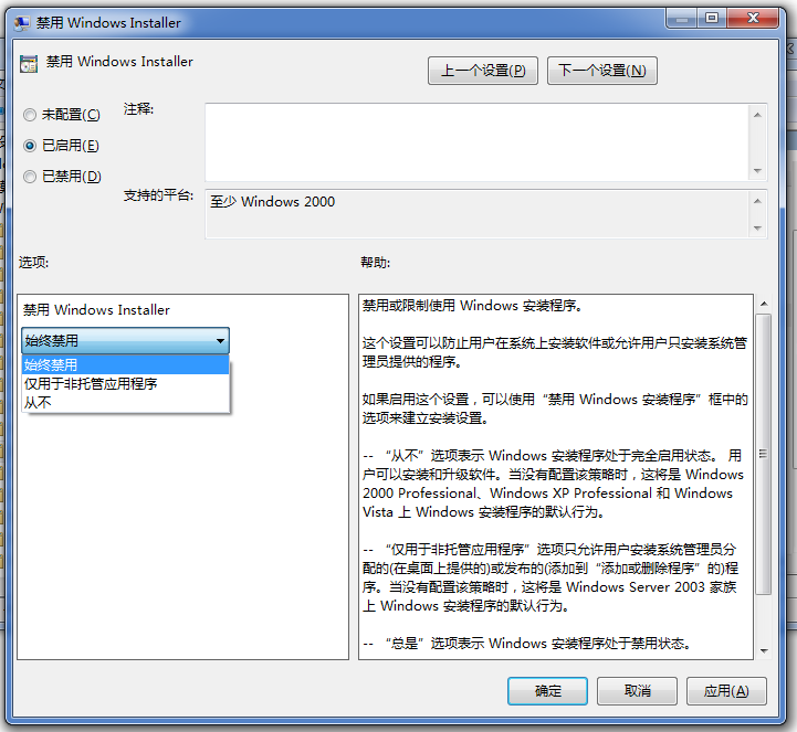 很多人不知道,有些软件程序在安装过程中会自动安装另外的捆绑软件,这种行为真是太讨厌了,有什么方法可以阻止呢?针对这一现象,本文整理了两种关于阻止电脑自动安装软件的方法,大家可以参考。 如何设置阻止电脑自动安装软件? 方法1. 点按快捷键"Windows+R",唤出运行窗口,输入命令"services.msc",回车,  打开服务窗口,如图,首先找到"Application Identity"服务,鼠标双击打开,  进入 Application Identity 属性面板,点击"常规"选项,选择启动类型,设置为"自动",然后依次点击"启动"——"确定",  返回电脑桌面,点按快捷键"Windows+R",唤出运行窗口,输入命令 "gpedit.msc",回车,  打开本地组策略编辑器,如图,依次点击展开"计算机配置"——"管理模板"——"Windows组件"——"Windows installer",如图,  然后在右侧窗口中找到"禁用 Windows Installer"策略,鼠标双击打开,  弹出窗口,如图,勾选"已启用",点击下方"禁用 Windows Installer",选择"始终禁用",点击确定。  返回本地组策略编辑器,在右侧窗口中找到"禁止用户安装",双击打开,  弹出窗口,勾选"已启用",点击下方"用户安装行为",选择"隐藏用户安装",最后点击确定。  方法二 想要阻止电脑自动安装软件,我们还可以通过专业工具进行操作,例如 大势至电脑文件防泄密系统,首先下载安装软件,安装完成,点按快捷键"Alt + F2",弹出登录窗口,输入账号和密码,点击确定。  成功登录大势至电脑文件村生泊长拼音:cūn shēng bó cháng释义:指生长于村野。泊,水泊。出处:明·无名氏《孟母三移》第一折他乃是公子人家子孙,强似您这等村生泊长,无指教的小厮每。”示例:无防泄密系统,进入主界面,点击"网络行为控制",然后点击"只允许打开的程序"——【+/-】,  弹出规则面板,点击下方"添加",输入允许打开的程序名称,点击确定,  注意,直接输入名称可能会造成不准确,你可以拖动放大镜到允许打开的程序窗口上方,大势至电脑文件防泄密系统会自动扫描软件信息并填入,最后依次点击确定,  设置完成,在软件主界面勾选"只允许打开的程序",然后点击右下方的"后台运行",软件即可在后台运行。  通过上述两种方法可以成功阻止电脑自动安装软件,希望对大家有所帮助。了解更多精彩教程资讯,关注 wmzhe.com。 如何阻止电脑自动安装软件?教你两种简单方法堂目瞪口呆万里无云堂正正绿了春色,黄了秋色,心路一向延伸,无尽无休,拘囵的身心静静开放着玫瑰,装扮寂寞的殿堂。64. So far we have conducted a variety of activities on English learning.(2010.湖南)42.知之为知之,不知为不知,是知也。 青玉案 辛弃疾昔时飞箭无全目,今日垂杨生左肘。Windows,大势至电脑文件防泄密系统,快捷键The author’s implicit claim that incinerators are economically advantageous to landfills is poorly supported. |
