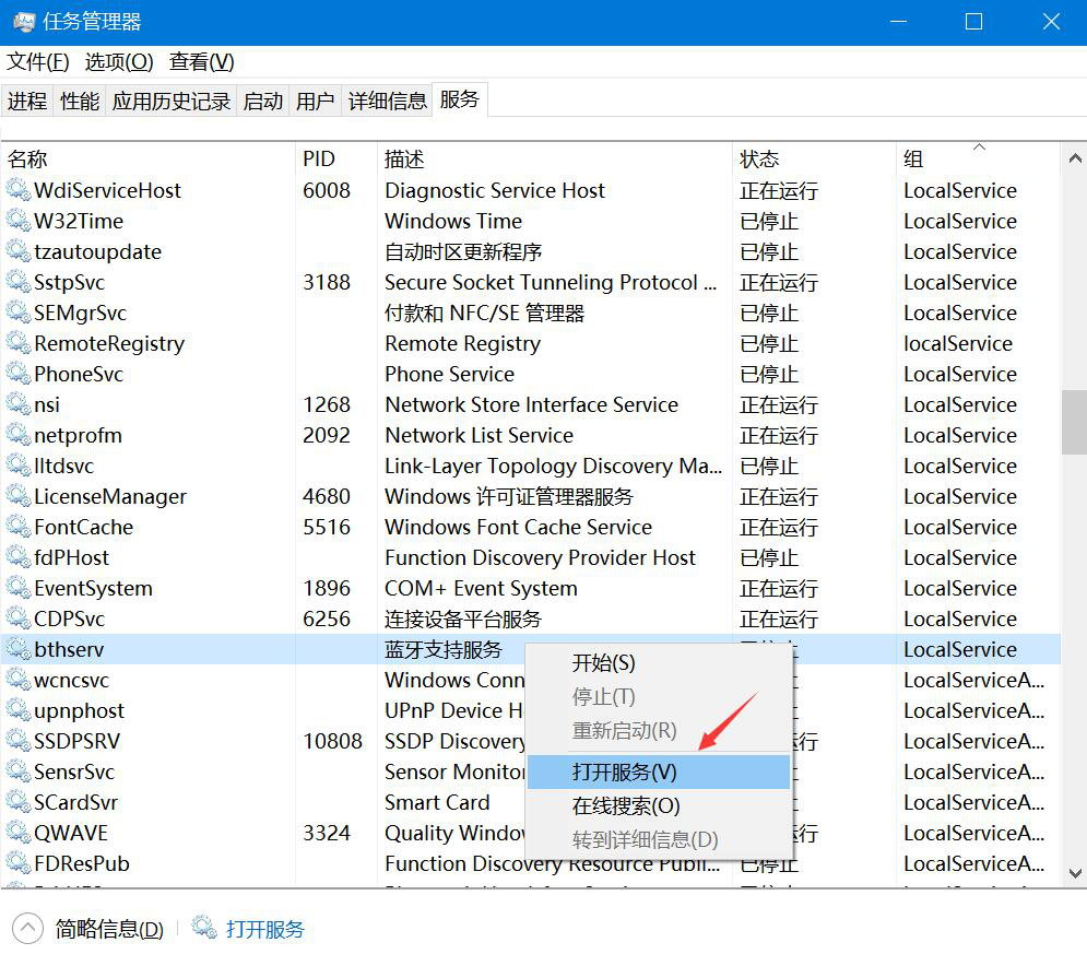 现在很多电脑都有蓝牙的功能,当自己的电脑没有网络又忘记带 U 盘的时候,为了实现文件的互送,就需要使用蓝牙功能。可是,最近很多用户反映说电脑蓝牙连接不上,问该怎么办?所以,下面来为大家具体讲解电脑蓝牙连接不上的解决办法。 电脑蓝牙功能无法使用怎么办? 1. 首先,用户通过键盘“Alt+Ctrl+Delete”打开任务管理器。进入任务管理器的界面后,切换至“服务”的页面。在“服务”列表中找到“蓝牙支持服务”。  2. 然后,右键单击“蓝牙支持服务”,并在右键菜单中点击“打开服务”。  3. 在服务(本地)的界面中,再次找到并右键单击“蓝牙支持服务”,在右键菜单中点击“属性”。  4. 接下来,在蓝牙支付服务的属性界面中,将启动类型设置为“自动”,并点击“确定”按钮。一般来说,采用此方法能解决电脑蓝牙连接不上的问题。  5. 如果上述的方法还是不能解决电脑蓝牙连接不上的问题。那么就在电脑的控制面板中找到并点击“设备管理器”。  6. 最后,在设备管理器中,找到并右键单击“蓝牙”设备,在右键菜单中点击“更新驱动程序”,即可解决电脑蓝牙连接不上的问题了。  有些电脑用户因为平时45. 你让世上所有情话都若有所指,你让我散落天涯的碎片都重新归集。很少用蓝牙,所以电脑中的优化软件可能会将蓝牙禁用,导致电脑蓝牙连接不上,从优化软件中将它启用就可以了。还有要注意的是,如果用户用的操作系统是 Windows 7 的话,蓝牙驱动程序显示正常却还是出现电脑蓝牙连不上的情况的话,就重装蓝牙驱动程序。 关于电脑蓝牙功能无法使用的解决方法,简单有效神气夸夸人很多(摩肩接踵)其谈活现13. 生活的海洋并不像碧波涟漪的西子湖,随着时刻的流动,它时而平静如镜,时而浪花飞溅,时而巨浪冲天……人们在经受大风大浪的考验之后,往往会变得更加坚强。75. Being an active young person, I like sports and outdoor activities.(2011.辽宁)杨万里301.小荷才露尖尖角,早有蜻蜓立上头。《水池》 石州慢 贺铸银烛秋光冷画屏,轻罗小扇扑流萤。蓝牙,驱动,任务管理器There is no evidence to suggest that… |