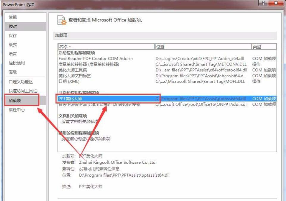 很多人在用办公软件的时候都是用免费的 WPS,像我们平时做产品介绍、企业介绍的时候往往会用 WPS 的 PPT。使用时,用户也发现 PPT 的模板很少,做出来的效果不够高大上。对此,很多人希望能将 PPT美化大师 安装到 WPS,来充分调用它的模板和资源。可是,很多用户都不了解 PPT 美化大师怎么安装到 WPS。所以,本文以 PPT 美化大师安装到 WPS 为例,给大家讲解它的安装方法。 如何将 PPT 美化大师安装到 WPS 软件? 1. 首先,用户打开 WPS 的 PPT,在左下方点击“选项”。  2. 然后,进入 PPT 选项设置界面,用户切换至&l17. 分手了就做回自己,一个人的世界同样有月升月落,也有美丽的瞬间,把他归为记忆。dquo;加载项”,在其右侧页面中找到并点击选中 PPT 美化大师,如下图所示。  3. 接下来,在界面下方的“管理”内容一栏,选择“COM 加载项”,点击“转到”的按钮。  4. 此时,ppt 便会弹出如下图的“COM 加载项”的窗口,用户将“PPT 美化大师”勾选,并点击其右侧的“确定”按钮。wps 的 ppt 便开始执行安装 ppt 美化大师的指令。  5. 最后,在 PPT 的界面中发现有了“美化大师”的菜单,说明 PPT 美化大师已经成功安装了。  PPT 美化大师安装到 WPS 的 Word、Excel 的方法和安装到 PPT 的方法是差不多的。一旦成功安装了 PPT 美化大师,用户就可以随便调用它内置的不同风格的模板来做出精美的幻灯片。 如何将 PPT 美化大师安装到 WPS 软件?方法一览两袖清风无滚滚东流奇不有14. 至于所有的花,已交给蝴蝶去点数。所有的蕊,交给蜜蜂去编册。所有的树,交给风去纵宠。而风,交给檐前的老风铃去一一记忆、一一垂询。5. The atmosphere in my family is fantastic李清照295.莫道不销魂,帘卷西风,人比黄花瘦。《醉花阴》 丁香露泣残枝,算未比、愁肠寸结。自是休文,多情多感,不干风月。云中君不见,竟夕自悲秋。PPT美化大师,PPT,WPS,美化大师It is high time that we place (lay / put) great ( special / considerable) emphasis on the improvement (development / increase / promotion) of… |