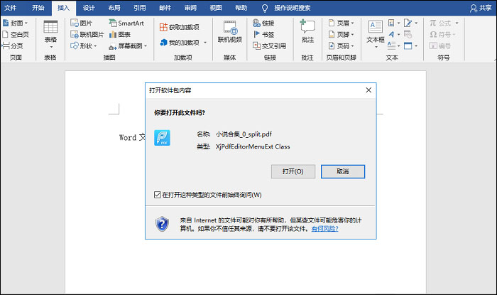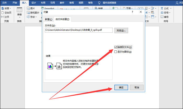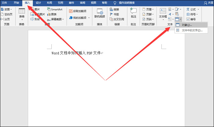 日常办公,大家经常会在 Word 和 Excel 文件中插入图片、链接,如果想要插入 PDF 文件,应该如何操作呢?下文整理了在 Word 和 Excel 中插入 PDF 文件的简单方法,有需要的小伙伴可以学习了解。 如何在 Word 和 Excel 中插入 PDF 文件?Word 1. 打开一个 Word 文档,将鼠标光标移动到目标区域位置,在上方菜单栏中点击“插入”->“文本”->“对象”命令,  2. 弹出窗口,如图,点击“由文件创建”,选择“游览”,导入 PDF 文件,完成添加,  3. 如图,你可以勾选“显示为图标”或者“链接到文件”,进行显示设置,这里选择“链接到文件”,点击确定,  44. 背叛伤害不了你,能伤你的,是你太在乎。分手伤害不了你,能伤你的,是回忆。无疾而终的恋情伤害不了你,能伤你的,是希望。你总以为是感情伤害了你,其实伤到你的人,永远是自己。4. 插入 PDF 文件之后,在鼠标位置会呈现出 PDF 文件图表,点击即可进行链接跳转。  Excel 1. 如图,新建一个 Excel 工作簿,将鼠标移动到需要插入 PDF 文件的单元格,在上方菜单栏中点击“插入”->“文本”->“对象”功能,  2. 弹出对象窗口,如图,点击切换“由文件创建”,在文件名右侧选择“浏览”,找到指定的 PDF 文件,将其添加,  3. 现在选择勾选“显示为图标”或者“链接到文件”,最后点击确定,  4. 在 Excel 表格中成功插入 PDF 文件,双击 PDF 图标就会出现提示,如图,点击“打开”,即可打开 PDF 文件。  了解更多精彩教程资讯,关注 wmzhe.com。 -