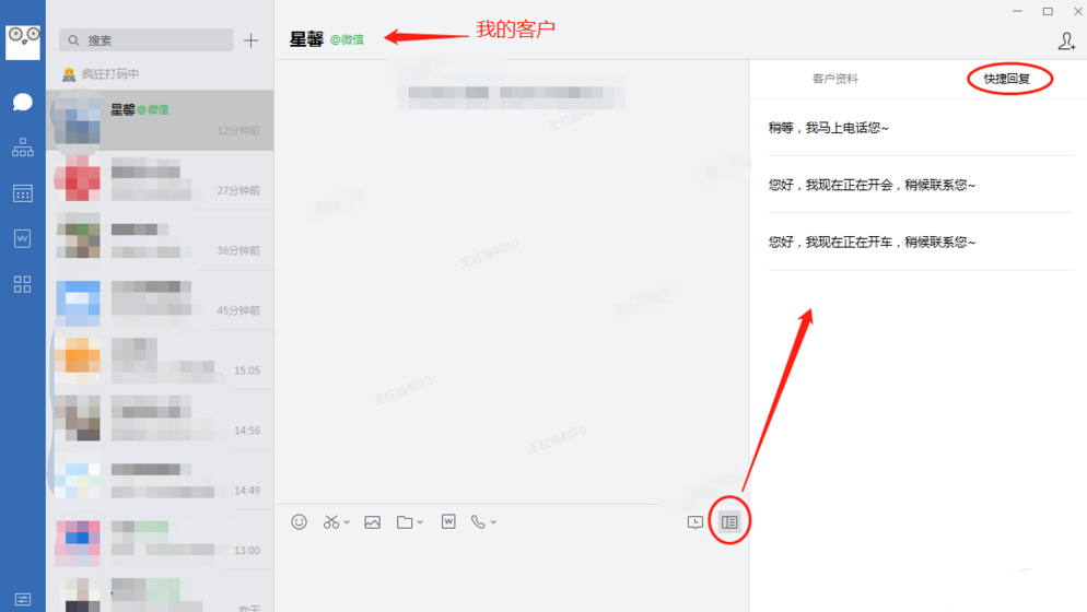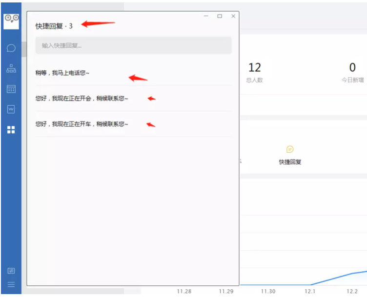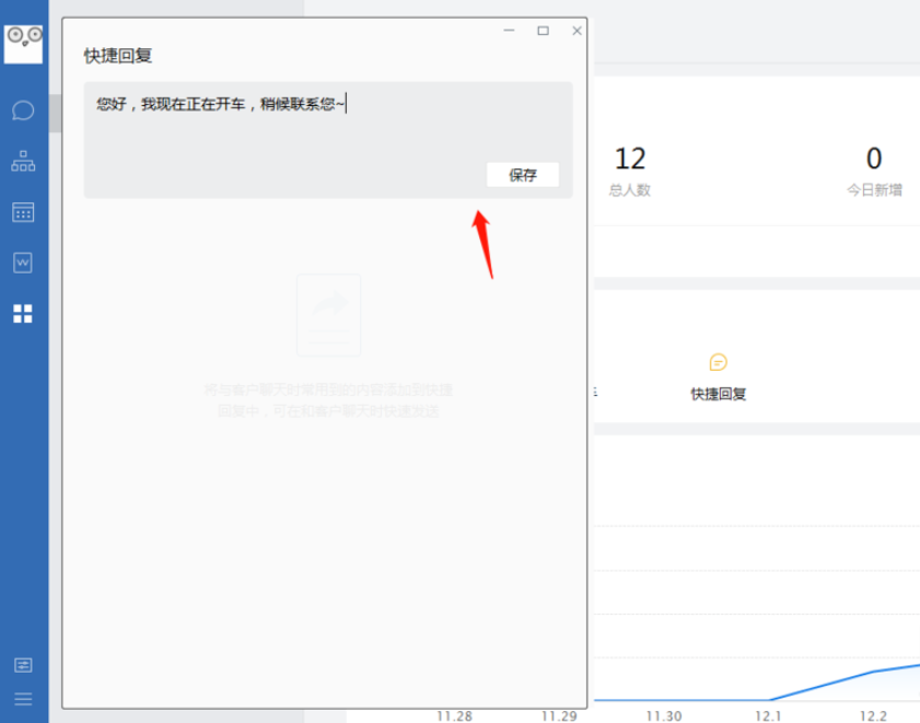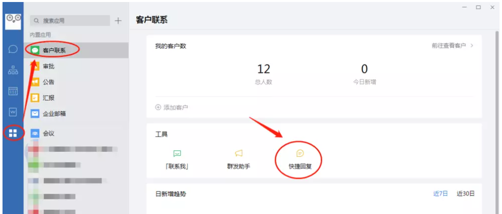 目前,多家公司组织都在使用企业微信作为办公社交软件,为了快速响应客户、回答提问,我们可以启用快捷回复功能。升级企业微信,即可设置添加快捷回复内容,及时响应客户、与其聊天。 企业微信如何设置使用快捷回复功能?电脑端 在电脑中打开企业微信,登录账号,进入界面,在左侧栏点击“工作台”,然后点击“客户联系”->“快捷回复”,  打开快捷回复工具,如图,在对话框中输入快33. 窗外雨在下,一颗挨着一颗,我的泪水也蓬勃了,如窗外那断了线的雨珠。捷回复内容,  输入完成,选择保存,即可添加快捷回复短语,  为了合理利用快捷回复,你可以多设置一些回复内容,然后重复添加保存,  现在随意点击一个客户,进入聊天窗口,如图,找到快捷回复按钮,即可查看你设置的快捷回复内容,  点击选择合适的快捷回复内容,它就会出现在聊天对话框,点击“发送”,即可实现快速答复客户。 手机端 在手机中打开 企业微信 APP,进入界面,点击下方“工作台”,如图,找到“客户联系”、“客户群”,  这里点击“客户群”选项,进入界面,在工具中点击“快捷回复”,  跳转至新的界面,如图,点击“新建快捷回复”,  在对话框中编辑输入快捷回复内容,点击“完成”,即可添加,如此一来,你就可以在繁忙状态下及时回复客户。  注意:企业微信移动端、桌面端均支持快捷回复功能,但是仅限于拥有“客户联系”使用权限的成员才能使用。想了解更多精彩教程资讯,关注 wmzhe.com。 -