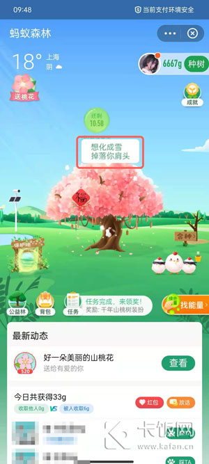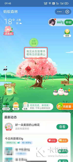 蚂蚁森林树洞在哪里?在520这一天,蚂蚁森林上线了千年山桃树装扮,使用该装扮可以听到520年的告白,截图发给您喜欢的人替你告白,那在哪里可以听到树洞告白呢25. 别说一辈子,别说永远,谁能对未来承诺呢?我们能把握的,无非是当时当地的感情。但一辈子,也是无数个现在组成的,努力好了每个瞬间,也就是永远了。,下面就和小编一起来看看吧! 1、打开支付宝,在首页点击【蚂蚁森林】进入,也可以搜索或者点击更多进入;  2、在蚂蚁森林页面,根据【任务】领取到千年山桃树装扮,点击这里查看领取教程;  3、当我们的树变成桃树之后,点击树就可以看到树洞告白了;  4、而且每次点击出现的告白语都不相同,多次点击看多个告白语;  5、在微博参与#蚂蚁森林树洞#话题 ,将树洞的告白语截图发微博,有机会获得山桃勋章。  以上就是蚂蚁森林树洞怎么玩的全部内容了,希望以上内容对您有所帮助! 蚂蚁森林树洞怎么玩一模一样人山万点繁星人海21. 前生的五百次回眸,换来今生的一个檫肩而过,今生的五百次檫肩而过,换来世的一次回眸55. As a student, there is nothing better than being praised by my teacher before my classmates.(2015.湖南)30.一年之计,莫如树谷;十年之计,莫如树木;终身之计,莫如树人。 午梦千山,窗阴一箭,香凝瘢新褪红丝腕。隔江人在雨声中,晚风菰叶生秋怨。醉不成欢惨将别,别时茫茫江浸月。支付宝8、Faith can move mountains. |