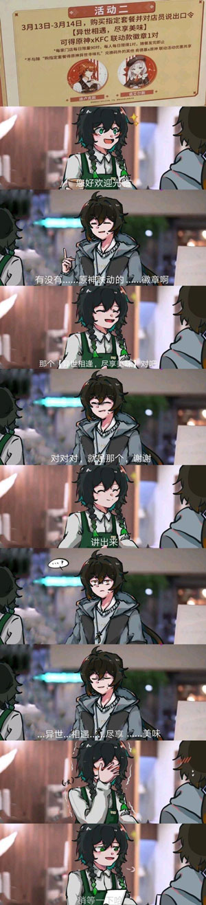 在抖音中有很多关于游戏的梗,最近大火的原神也没逃过被安排的命运,所以最近有一个关于原神的一个梗出现,就是在KFC中购买原神的套餐,要喊出一句异世相遇尽享美味,很多用户不知道异世相遇尽享美味什么梗?那么下面就让小编给大家介绍一下。  这个梗是游戏原神和KFC联合做出的一个活动,在活动期间玩家只需要区肯德基线下的门店去购买指定的活动套餐就可以获得原神的一个联动徽章,还会获得游戏中一个羽翼的CDK兑换码,所以活动非常火爆。 因为在游戏中羽翼是非常稀有的,所以很多用户是比较想要获得的,因为原神的大火,带动了相关的活动,但是想要获得这些也不是这么简单的,玩家需要在购买套餐时大声的喊出【异世相遇尽享美味】,所以这就造成了社会性死亡,喊出来以后就会被当成二次元宅男宅女玩家,接受很多其他顾客的注视。  只是在肯德基店员面前说出来就已经够羞耻了,但是抖音视频中有的店是需要大声喊出来,所以就直接造成了全是二次元玩家聚集,喊口号的场面,在喊出来的瞬间造成哄堂大笑,店里二次元玩家多还好,都可以理解,要是都是普通顾客,简直就是社会性死亡现场。 不得不说原神的玩家为了徽章和道具也是拼了,不顾脸面的想要去抢购一个二次元套餐,因为活动非常大,玩家非常多,所以相关的一些视频也出现在了抖音上,让很多网友都捧腹大笑,感叹这种社会性死亡现场的尴尬。  在玩家去购买的过程中,只需要说出想要一份联动套餐,店员就知道是原神的套餐,但是想要徽章的话就需要喊出那句口号,有的店员想要调侃一些玩家,就会让玩家大声的喊出来,所以场面是十分美好的,只要我不尴尬,尴尬的就是别人。 并且这份套餐是比较多的,很多女孩子是吃不完的,只想要一个徽章,所以就出现了代吃的出现,真的是商机无限,不仅可以白嫖还可以获得玩家之间的尊重和好感,也是一种有趣的交流方式。  29. 人生难免要遭遇挫折与失败,与其用泪水洗刷悔恨,不如用微笑去迎接新的挑战。这个梗就是源自原神游戏和肯德基的活动,然后因为抖音的视频爆火,成为游戏界的一个非常搞笑的梗,在活动当天整个肯德基店都被二次元我那家挤爆了,但是很多店铺是没有这个活动的,所以就造成了玩家聚堆购买套餐。      异世相遇尽享美味什么梗心无穷无尽大惊失色慈面善10. 记忆是一朵浸泡在水里的白色含笑,盈盈地沾了满把的水分,只是轻轻地触碰,枯涩就这样肆无忌惮地溢上来,措手不及。34.为社会做贡献 make contributions to the society杜甫179.穷年忧黎元,叹息肠内热。《自京赴奉先县咏怀五百字》 扬州慢 姜夔秋草独寻人去后,寒林空见日斜时。71、A letter from home is a priceless treasure. |