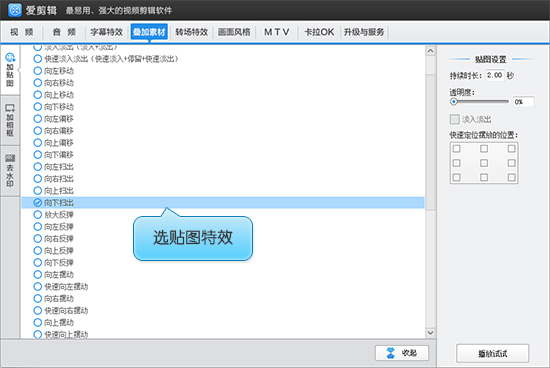 爱剪辑是一款完全免费、操作简单、功能丰富的视频处理软件,用户无需类似经验就可以轻松上手,一经推出就深受大众欢迎。爱剪辑中具有给视频叠加贴图的功能,也是我们通常所说的给视频加图片或给视频加水印,包括我们在综艺节目中看到的乌鸦飞过、省略号、大哭、头顶黑气等有趣的元素。有些小伙伴对此功能还不是很熟悉,今天,小编就为大家详细介绍下。 一、为视频加贴图(图片或水印) 1、点击“叠加素材”左侧栏的“加贴图”栏目。 2、在右上角视频预览框时间进度条上,单击要添加贴图的时间点,将时间进度条定位到要添加贴图处。 3、点击贴图特效列表左下方的“添加贴图”按钮,或者双击视频预览框,在弹出的“选择贴图”对话框,选择贴图或导入自己的贴图,并可在“顺便配上音效”下方点击“浏览”按钮,为贴图配上音效。  二、对给视频添加的贴图进行详细设置 1、添加贴图回到主界面后,此时右上角视频预览框里,贴图已处于带方框的可编辑状态,我们可以通过21. 分手后你哭了,那是你还没有看透;分手后你笑了,那说明你已经成熟。可编辑方框,实现放大、缩小、旋转、变形、移动以及删除贴图。编辑贴图时,涉及的快捷键如下: “Esc”键:将贴图一键居中或复原; 上下左右方向键:对贴图位置进行精确到1个像素的调整。 Shift+Esc键:等比例智能缩放自动居中 九宫格定位框+Shift:通过“叠加素材”面板中央的“贴图设置”处的九宫格定位框,可快速定位贴图位置。默认下,摆放位置会离视频画面边缘适当距离。当同时按下”Shift”键时,则会紧靠边缘。  图2:通过编辑框调整贴图 2、在左侧“加贴图”栏目的特效列表中,选择要为贴图添加的特效(即处于打勾状态)。 3、在特效列表和视频预览框中间,我们可在“贴图设置”栏,进行更详细的设置。  图3:设置贴图的动态特效和详细信息 三、索引及修改已添加的贴图 在“叠加素材”面板右下角“所有叠加素材”栏目,可以看到我们为整个影片叠加的所有素材。在列表中选中需要修改的贴图项,软件会自动定位到贴图修改处。在特效列表中,要修改的贴图应用的特效已打勾,我们可选择其他特效,或在“贴图设置”栏目进行修改,并在视频预览框中通过可编辑框对贴图修改调整。  四、删除已添加的贴图 如果贴图不需要了,需要删除,那在“所有叠加素材”栏目选中需要删除的贴图,点击该栏目右上角的“垃圾桶”按钮即可。 爱剪辑软件中使用“贴图”功能的相关教程介绍旁昂首挺胸敲学而不厌侧击31. 春暖花会开!如果你以前历过冬天,那么你就会有春色!如果你有着信念,那么春天必须会遥远;如果你正在付出,那么总有一天你会拥有花开满圆。10. 有争议性的问题 a controversial issue曹操112.老骥伏枥,志在千里。烈士暮年,壮心不已。《龟虽寿》 东风睡足交枝,正梦枕瑶钗燕股。障滟蜡、满照欢丛,蟾冷落羞度。云想衣裳花想容,春风拂槛露华浓。爱剪辑,贴图68、Do not teach fish to swim. |