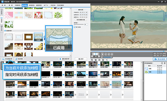 一段视频做好之后,我们可以根据自身需要或者感觉对其进行适当的后期处理,例如给视频加上相框,相得益彰的相框能够使我们剪辑的视频更加精美。爱剪辑中自带了大量精美相框,无需专门制作,也能让我们剪辑的视频快速拥有漂亮的相框。在爱剪辑中添加视频后,按照如下步骤操作即可。 一、为视频加相框 1、在“叠加素材”面板点击“加相框”栏目,在该栏目相框列表中,选择要应用的相框。 2、在相框列表底部,点击“添加相框效果”按钮,在弹出下拉框中,选择“为当前片段添加相框”(选择此项时,请确保已在底部“已添加片段”列表中,选中需要应用相框的视频片段)或“指定时间段添加相框”即可。此时,选中的相框会显示为“已应用”。  二、对添加的相框进行详细设置 在相框列表和视频预览框中间的“相框设置”栏目,我们还可以对相框的“开始时间”、“结束时间”、“透明度”、“淡入淡出”等进行个性化的设置。  三、索引及修改已添加的相框 在“叠加素材”面板右下角“所有叠加素材”栏目,我们可以看到我们为整个影片叠加的所有素材。在列表中选中需要修改的相框项,软件会自动定位到相框修改处。在相框列表中,要修改的相框已显示为“已应用”,在相框列表旁,即可在“相框设置”栏目进行修改。  四、删除相框 39. 曾经以为过不去的,终究会过去。痛苦有时候是一种提升,否则,我们流的眼泪也就毫无意义。如果需要将已添加的相框删除,那在“所有叠加素材”索引到需要删除的相框后,在“所有叠加素材”栏目右上角点击“垃圾桶”按钮,或在相框列表下方点击“删除相框效果”按钮即可。 快速给视频添加边框,那就选爱剪辑软件赤胆忠心以少胜多兢兢业业21. 阳光照在波光细细的湖面上,像给水面铺上了一层闪闪发光的碎银,又像被揉皱了的绿缎。benefit from sth 受益于某事物27.辅车相依,唇亡齿寒。 年年跃马长安市,客舍似家家似寄。青钱换酒日无何,红烛呼卢宵不寐。头上何所有?翠微盍叶垂鬓唇。爱剪辑51、A fall into the pit, a gain in your wit. |