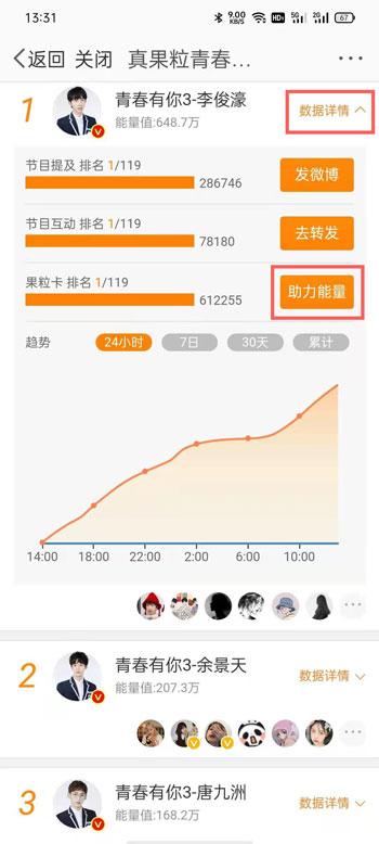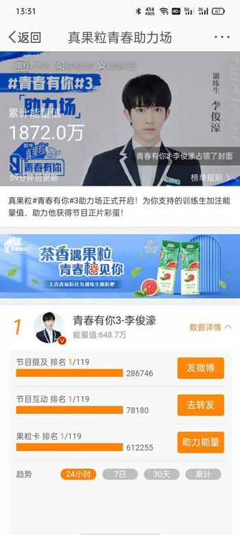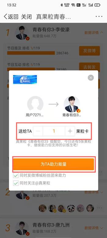 青春有你3投票通道在哪里?青春有你是最近几年非常热门的选秀节目,深受大家的喜欢,我们可以通过投票助力的方式,送我们喜欢的爱豆成团出道,那怎么为喜欢的爱豆投票助力呢?青春有你3投票通道入口在哪里?下面就和小编一起来看看吧! 3. 你们的恋爱不成功,全面的看,这是最好的结果。下意识里,你其实也希望有这样的结局。爱奇艺投票链接:点击打开>> 微博投票链接:点击打开>> 1、打开手机上安装的爱奇艺app,在首页点击上方的【搜索框】,进入搜索页面;  2、搜索【青春有你助力】,或者搜索【助力榜】,点击青春有你3助力榜进入投票页面;  3、在助力榜中,可以看到当前我们拥有的助力值,每天可以获得新的助力值为练习生助力;  4、下滑找到你想要助力的练习生,点击下方的【助力】,每助力一次会消耗1个助力值;  5、助力成功后将弹出助力成功页面,还可以生成对应的花卡。  1、打开手机上的微博app,搜索【青春有你助力】,然后在其他用户的发文中,点击网页链接进入;  2、也可以在本文的最上方找到微博投票链接,点击进入“真果粒青春助力场”;  3、下滑找到想要投票的练习生,点击右侧的【数据详情】展开,点击【助力能量】;  4、然后选择需要助力的果粒卡数量,点击下方的【为TA助力能量】按钮;  5、提示“助力成功”后即可成功为练习生助力。  以上就是青春有你3投票通道入口的全部内容了,希望以上内容对您有所帮助! 青春有你3投票通道入口东方欲晓急来海誓山盟抱佛脚18. 梦幻的笔,书写浪漫的情怀,犹若那深谷幽兰,暗香浮动,妩媚独舞。59. My deskmate admires my fluent English very much and I usually feel encouraged by his compliments.(2013.湖北)328.春色满园关不住,一枝红杏出墙来。叶绍翁《游园不值》 江神子慢 田为潭烟飞溶溶,林月低向后。35.As the tree,so the fruit. 种瓜得瓜,种豆得豆。 |