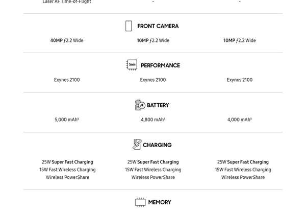 苹果今年在推出iPhone 12系列时取消了包装中附赠的充电器,虽然宣称是为了环保,但是依然引来了全球用户的无尽吐槽。 根据近期多方爆料,三星也将效仿苹果的环保策略,在Galaxy S21系列新机的包装中取消充电器的附赠。  曝三星Galaxy S21系列取消附赠充电头 更重要的是,据国外知名爆料人@evleaks的最新消息,三星此次还将为Galaxy S21全系标配25W“快充”,与iPhone 12系列的20W快充相差无几。 在这个国内厂商连千元机都能给出50W快充的2021年,可谓是非常“不厚道”了。  三星Galaxy S21全系仅支持25W快充 不过,虽然三星Galaxy S21系列的快充不尽人意,但是在其他方面却配备了极其强悍的硬件配置。 综合目前消息来看,三星此次依然会推出三款不同机型,分别是Galaxy S21、Galaxy S21+和Galaxy S21 Ultra,均搭载高通顶级处理器骁龙888。  三星Galaxy S21/S21+硬件配置基本一致 其中,三星Galaxy S21/S21+采用了同样硬件规格,仅在机身和屏幕尺寸等方面有所区别。分别采用6.5英寸和6.7英寸的FHD+显示屏,最高支持120Hz刷新率;电池容量则分别为4500mAh以及4800mAh,支持25W快充。 作为顶级机皇的Galaxy S21 Ultra则配备了更加强大的配置,屏幕升级为3200×1440分辨率的6.8英寸显示屏,首次支持了2K+120Hz同时开启,以及动态的刷新率调节。  网曝三星Galaxy S21 Ultra真机谍照 相机方面是Galaxy S21 Ultra升级的重点之一,三星为其配备了潜望式的四摄方案并且还在两个长焦镜头上都加入了OIS光学防抖,这会给成像效果带来极大的提升。此前只有华为Mate40 PRO+采用了类似的配置,而后者目前的拍照成绩是DXO全球排名第一。 但从硬件参数上来说,三星Galaxy S21 Ultra无疑是三星迄今为止最强机皇,放眼整个业界也只有苹果、华为的顶级旗舰方能与之一战了。 值得注意的是,此前有消息称三星Galaxy S21的售价是自Galaxy S9发布以来,首次起售价低于100万韩元的Galaxy S系列手机,是近三年最便宜的三星旗舰手机。 其中,三星Galaxy S21的售价为99万韩元,约为5865元人民币 三星Galaxy S21+售价为119.9万韩元,约为7103元人民币。 三星Galaxy S21 Ultra售价为145万35. 分手后,就不要留恋过去,时光的流逝,可以使人淡忘很多往事,但彼此间的爱意,却永远都不会磨灭。韩元,约为8590元人民币。 更多的信息将会在今晚23点的发布会正式公布,尽请期待。 曝三星Galaxy S21全系仅支持25W快充 不送充电头声东击西滚漫不经心滚东流人生道路虽很曲折,却很美丽。只要你细心观看,就能饱尝沿途美景。就我个人而言,骑自行车是一个解决空气污染的好办法。360.有缘千里来相会,无缘对面不相逢。 霭霭春空,画楼森耸凌云渚。紫薇登览最关情,绝妙夸能赋。惆怅相思迟暮,记当日、朱阑共语。塞鸿难问,崖柳何穷,别愁纷絮。178王维:和贾舍人早朝大明宫之作63、Clumsy birds have to start flying early. |
