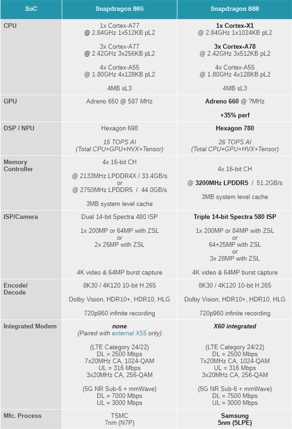 全新的高通骁龙888已经发布,具体的参数也已经曝光,想要知道骁龙888比上一代骁龙865提升了多少的小伙伴们可以看一下这篇对比文章,很多用户都是第一时间关注的,那么下面就让小编给大家介绍一下。  1、骁龙 865 搭载了 4 个 Cortex-A77 性能核心和 4 个 Cortex-A55 效率核心,由台积电采用其 7 纳米制造工艺制造,辅以 Adreno 650 图形处理器。骁龙 888 采用三星 5nm 工艺制造,搭载 1 x 2.84GHz (ARM 最新 Cortex X1 核心)+3 x 2.4GHz (Cortex A78)+4 x 1.8GHz (Cortex A55)核心,CPU 综合性能提升了 25% 之多,GPU 为 Adreno 660,性能提升了 35% 之多; 2、骁龙 888 搭载 X60 调制解调器上,号称可以在全球范围内提供最佳的 5G 速度,并标榜自己是全球首个允许聚合 Sub-6、TDD 和 FDD 网络的产品。与骁龙 865 搭配的 X55 支持 5G,但不支持这些不同频段的组合; 3、865 的图像处理能力达到了高达每秒 2 千兆像素,可以拍摄高达 8K 分辨率的视频、高动态范围的 4K 视频以及每秒 960 帧的慢动作视频,该芯片还支持村野匹夫拼音:cūn yě pǐ fū释义:村野荒村山野。匹夫平民百姓。旧指没有知识、没有地位的人。出处:明·罗贯中《三国演义》第六十五回马超曰‘吾家屡世公侯,岂识村野匹夫。’”示例:无高达 2亿 像素的静态图像拍摄。在 2021 年,这些能力将随着骁龙 888 的推出而升级,该芯片处理图像的速度为每秒 2.7 千兆像素,提升了 37%; 4、新的骁龙 888 包含了每秒 26 太操作(TOPS)的人工智能性能。作为对比,骁龙 865 的最高速度为 15TOPS。速度提升 73%,将实现新一代的图像和声音识别,以及游戏、AR 等处理; 5、在游戏方面,骁龙 865 已经是移动游戏设备的佼佼者,但骁龙 888 承诺在这方面也会有 35% 的提升。  以上就是骁龙888和骁龙865对比有哪些提升的全部内容,希望以上内容能帮助到朋友们。 骁龙888和骁龙865对比有哪些提升绚丽多彩手宽阔平坦忙脚乱传说有一种感情,纯纯似云,交错地美丽。像望不断的山水,袅袅;依依!电视不利于开发心智。276.昨夜西风凋碧树,独上高楼,望尽天涯路。《蝶恋花》 昼闲度,因甚天也悭春,轻阴便成雨?绿暗长亭,归梦趁风絮。有情花影阑干,莺声门径,解留我霎时凝伫。白头宫女在,闲坐说玄宗。What the arguer fails to understand (consider /mention) is that… |
