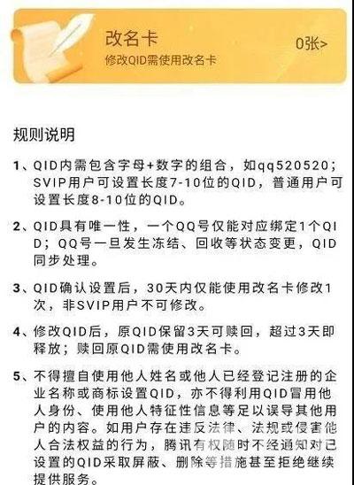 QQID身份卡是什么?在最近,QQ开启了QID功能的内测,和微信号一样,我们之后可以通过QID查找和添加好友,那QID身份卡具体是什么呢,我们怎么设置QID身份卡,下面就和小编一起来看看吧!  点击查看QID设置教程>> 1、【QID】是QQ目前还在内测的一个功能,类似于微信号,通过QID功能,每位用户都能自定义QQ的ID,并且还可以统御添加好友和外显,这一点和微信号相同; 2、QID具有唯一性,一个QQ号仅能对应绑定1个QID,QQ号一旦发生冻结、回收处理变更,QID同步处理; 3、QQ预计在11月25日上线QID功能,届时大家可在QQ中设置自己的QID,但是需要注意的是,QID内需要包含字母+数字的组合,SVIP用户可设置长度7-10位QID,普通用户可设置长度8-10位的QID; 4、QID确认设置后,可以使用改名卡修改,但是修改后30天内,仅能使用一次,并且只有SVIP用户可修改; 5、修改QID后,修改前的QID可保留3天赎回,超过3天即释放,而且赎回之前的QID也需要使用改名卡;  在目前QID功能已经47. 那些离别和失望的伤痛,已经发不出声音来了。处于内测状态,具体内测途径还未得知,但是在11月25日上线后,并不是所有用户可以参与体验注册QID,首批体验注册的用户只有7万个名额,尊贵的VIP 9可以抢先体验。 在11月25日上线后,大家可在QQ中抢先注册体验QID。 SVIP 9抢先体验QID:点击参与QID内测>> 以上就是QQID身份卡是什么的全部内容了,希望以上内容对您有所帮助! -