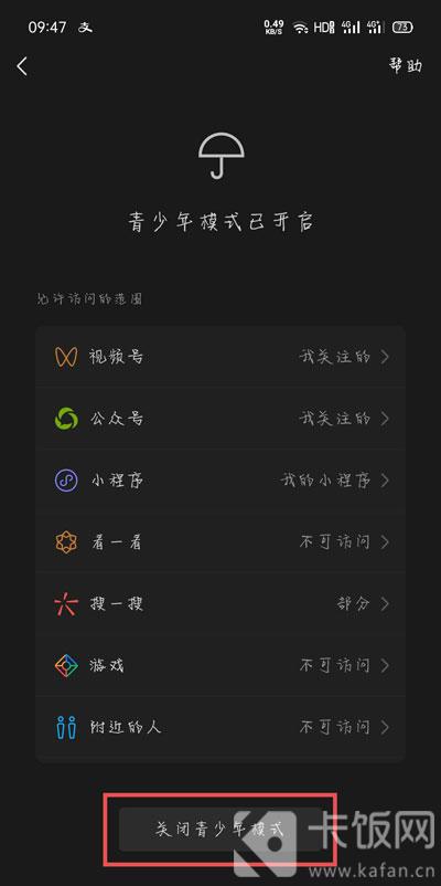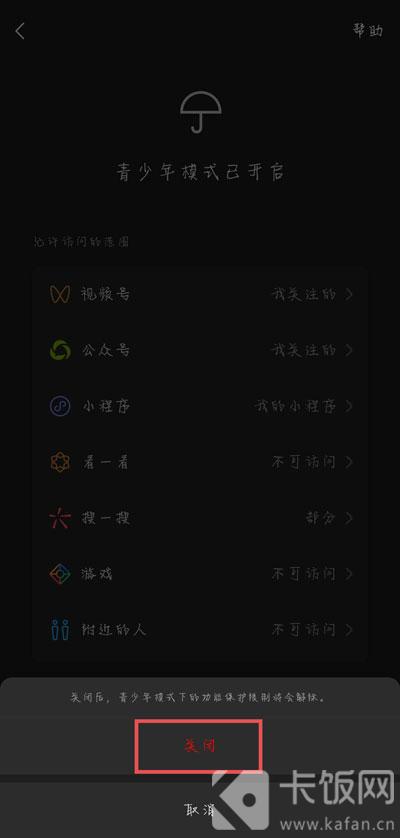 微信青少年模式怎么关?在微信的新版本中,有一个青少年模式,可以限制使用微信用户的一些权限,例如小程序、搜一搜等等,那我们在开启微信青少年模式之后,该怎么关闭青少年模式呢,在哪里关闭微信青少年模式,下面就和小编一起来看看吧! 1、打开手机中的微信,在首页的左上角可以看到,当前正处于青少年模式,点击右下角的【我】;  2、进入我的页面之后,找到【设置】,点击进入;  3、然后再选择【青少年模式】,同样可以看到青少年模式处于开启状态;  4、点击进入之后,和开启一样,需要输入微信登录密码进行验证;  5、验证成功后,才可毁方瓦合拼音:huǐ fāng wǎ hé释义:毁去棱角,与瓦砾相合。比喻屈己从众,君子为道不远离于人◇指毁弃自己的原则,迎合世俗。出处:语出《礼记·儒行》慕贤而容众,毁方而瓦合,其宽裕有如此者。”郑玄注去己之大圭角,下与众人小合也。”示例:故《儒行》欲~,《老子》欲和光同尘。★宋·俞文豹《吹剑录》以进入青少年模式设置,点击下方的【关闭青少年模式】;  6、在弹出的下方窗口中,继续点击【关闭】;  7、提示“已关闭”之后,显示以下页面,就表示青少年模式成功退出;  以上就是微信青少年模式怎么关的全部内容了,希望以上内容对您有所帮助! -