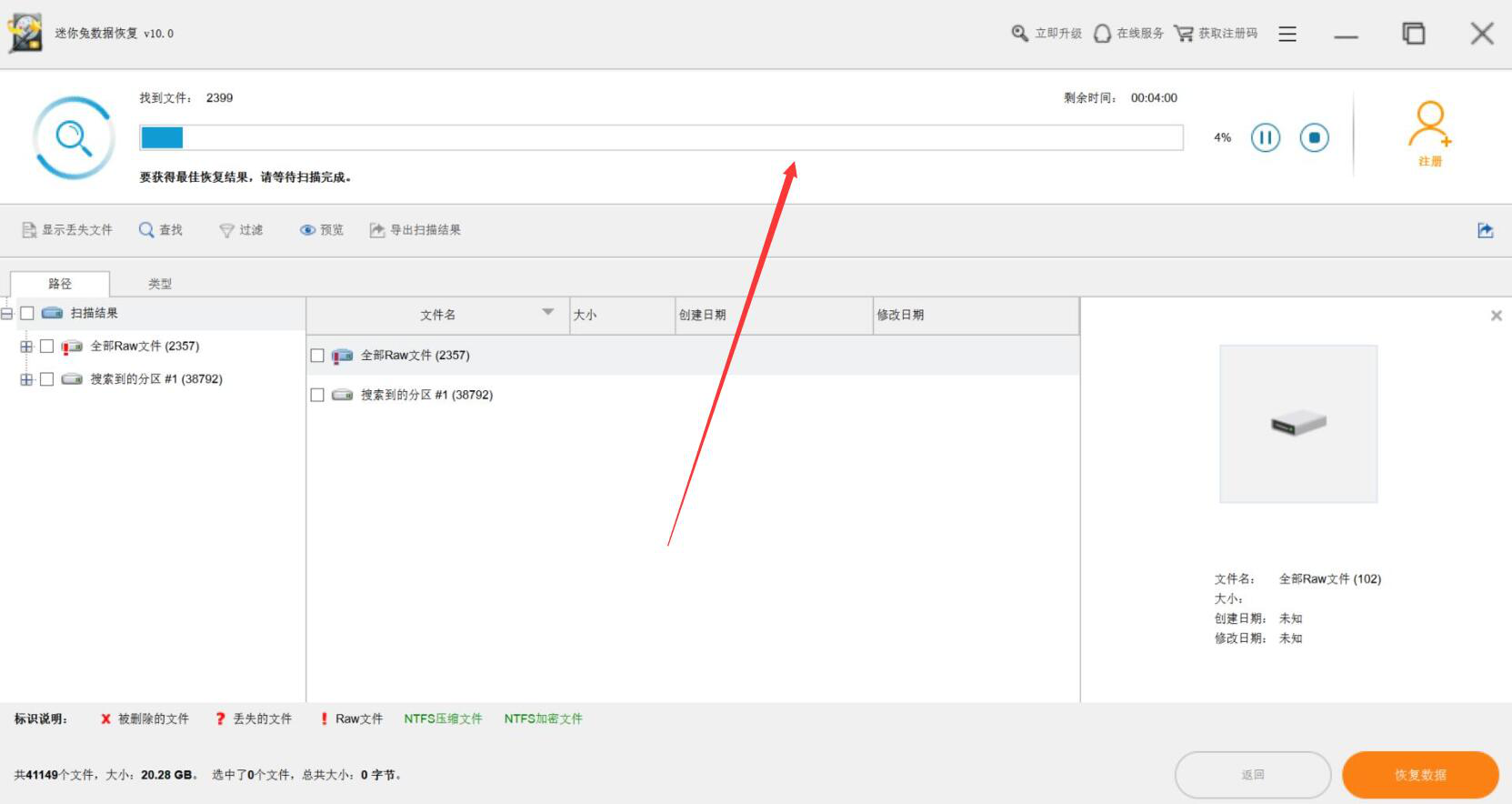 当某些文件被木马感染了,往往会被杀毒软件当成是病毒将其删除,导致磁盘数据丢失。特别是文件没有备份的情况下,有些人会选择重做文件。其实,我们可以用迷你兔数据恢复软件恢复磁盘丢失数据。考虑到很多人没操作过该软件,下面就来分享迷你兔数据恢复软件恢复磁盘丢失数据的教程,帮助大家找回数据。  迷你兔数据恢复软件如何恢复磁盘丢失数据? 1、首先,我们打开迷你兔数据恢复软件,在功能向导页面中点击“开始恢复”按钮。  2、然后,我们选择丢失的数据之前所存放的磁盘,再点击迷你兔数据恢复软件软件界面右下方的“扫描”按钮。  3、此时,我们在界面中便可以看到迷你兔数据恢复软件正在扫描该磁盘中丢失的所有数据。  4、当扫描完成时,我们双击迷你兔数据恢复软件界面左侧的“更多丢失文件(RAW)”文件夹,从而查看具体的磁盘丢失数据。  5、接下来,我们在迷你兔数据恢复软件界面中,勾选想要恢复的磁盘丢失数据,并点击界面右下方的“恢复数据”按钮43. 这一生最幸运的事就是与你相遇,最兴奋的事是与你相爱,最快乐的事是与你相聚,最悲伤的事是与你分离。。  6、此时,迷你兔数据恢复软件便会弹出如下窗口,我们选择丢失的磁盘数据恢复后的保存路径,再点击“确认”按钮。  7、最后,弹出如下窗口,说明迷你兔数据恢复软件成功地恢复了丢失的磁盘数据,并将其保存到我们设置的路径中了。  当遇到磁盘数据丢失的时候,先不用慌张,也不用着急着重新做数据。我们可以先尝试使用迷你兔数据恢复软件恢复丢失的磁盘数据。一般来说,只要距离丢失的时间不太久远,都能成功恢复。 -