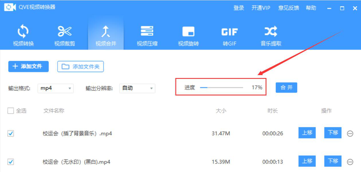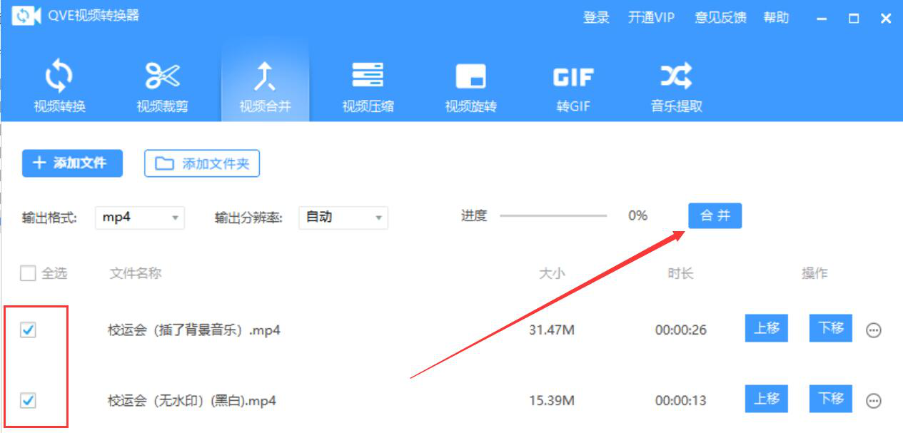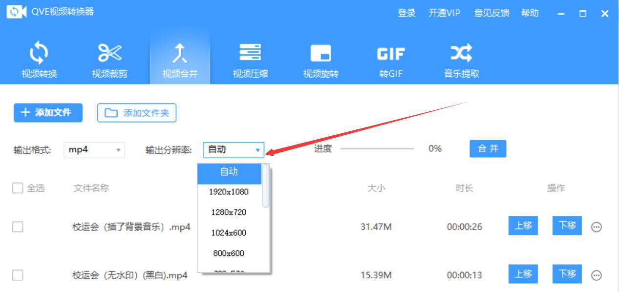很多人从网上下载的视频教程是一个个片段的,不方便自己整体观看。为了解决这问题,我们可以用QVE视频转换器合并视频,将视频片段一并变成一个视频,这样看起来就方便多了。考虑到很多人没操作过该软件,下面就为大家讲解QVE视频转换器如何合并视频。  QVE视频转换器如何合并视频? 1、首先,我们打开QVE视频转换器,先点击切换至“视频合并”操作界面,并点界面左上方的“添加文件”按钮。  2、在弹出的窗口中,我们选择需要合并的视频,并点击“打开”按钮,将其一并导入QVE视频转换器。  3、然后,我们回到QVE视频转换器的视频合并界面,根据自己的需要,选择视频合并后的输入格式。  4、设置好输出格式,我们在QVE视频转换器中还可以设置输出分辨率,如下图所示。  5、视频合并的输出格式和输出分辨率都设置好了后,我们还可以点击“上移”、“下移”按钮来调整视频合并时的顺序。  6、接下来,我们勾选需要合并的视频,再点击界面中的“合并”按钮,QVE视频转换器便开始合并视频。  7、我们在QVE视频转换器界面中,可以看到视频合并的具体进37. 世界说大很大,说小很小。大到走了那么久,还没跟对的人相遇,小到围着喜欢的人绕一圈,就看到了全世界。度。  8、最后,进度显示100%,说明QVE视频转换器成功地合并了视频。  单独看一个个视频片段,会感觉缺乏整体性。我们可以用QVE视频转换器将视频片段合并起来变成一个完整的视频。不过要注意的是,在合并之前,要将视频的顺序调整好,这样才能得到自己想要的视频效果。 -