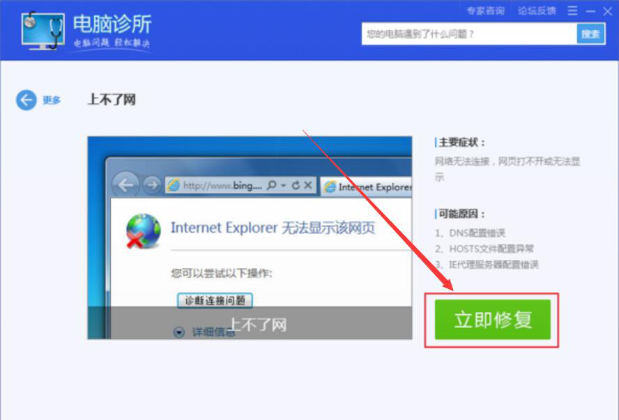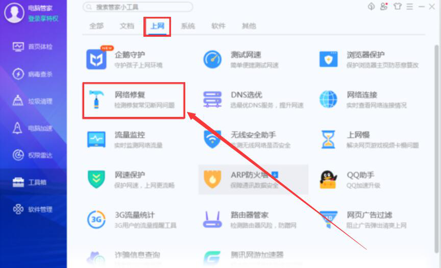 很多人说自己的网络明明还没有到期,可网页总是打不开,自己也试过杀毒和重启电脑,还是无法上网。我们可以用腾讯电脑管家来解决这问题,它能全面诊断和修复网络。考虑到很多人没操作过该软件,下面就为大家讲解怎么用腾讯电脑管家修复网络。  腾讯电脑管家如何修复网络? 1、首先,我们打开腾讯电脑管家,点击切换至“工具箱”操作界面。  2、然后,我们切换至腾讯电脑管家工具箱的“上网”选项卡页面,并点击“网络修复”功能选项。  3、接下来,我们进入腾讯电脑管家的网络优化操作界面,通过“流量监控”选项卡页面,可以看到下载速度和上传速度均为0KB/S,说明电脑是没有网络的。  4、为了修复网络,我们切换至腾讯电脑管家的“网络修复”选项卡页面,点击“全面检测”按钮,先对电脑进行检测。  5、此时,我们可以在网络修复选项卡中,看到腾讯电脑管家正在检测网络问题。  6、检测完成,我们可以在界面中看到网络问题的症状、原因,点击“立即修复”按钮,腾讯18. 失恋,并不使你痛苦,而你赋予失恋这个现象的附加意义,却将你击溃。电脑管家便开始修复网络。  7、最后,网络修复完成,在腾讯电脑管家的界面中会有相关的提示。我们也可以通过“点击验证”来检测网络是否成功恢复。  电脑网络出现故障,一般是由于DNS配置错误、HOSTS文件配置异常或者IE代理服务器配置错误而导致的。为了恢复上网,我们可以用腾讯电脑管家来修复网络。 -