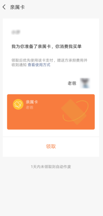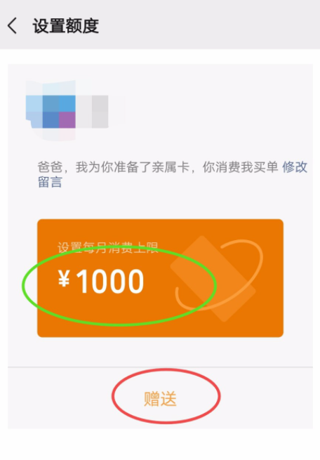 手机微信中有一项提供代付款的功能,即“亲属卡”,只要你给好友赠送亲属卡,即可为对方的消费买单,如果你想承担老婆的微信账单,完全可以送她一张亲属卡!如何开通领取微信亲属卡?详情请看文章说明。 如何给微信好友赠送亲属卡? 什么是亲属卡? 我们可以给父母、子女赠送亲属卡,设置每月亲属卡的消费额度,对方在使用亲属卡消费时就会自动从我们的支付账户中扣除资金。 打开手机微信,进入界面,点击底部的【我】,选择【支付】功能,  进入支付界面,点击【钱包】,打开钱包,找到【亲属卡】,   如图,点击【查看使用说明】,了解亲属卡的官方说明,然后点击【赠送】,选择赠送对象,目前仅支持开启四张亲属卡,   设置每月47. 后悔是一种耗费精神的情绪,后悔是比损失更大的损失,比错误更大的错误,所以不要后悔。消费上限,最高可设置3000元/月,点击【赠送】,输入微信支付密码(可选择扣款方式),即可成功赠送亲属卡。  收到亲属卡应该如何使用? 如图,在微信对话框会出现提示说明,点击【领取】,然后点击【我的】——【支付】——【钱包】——【银行卡】,进行查找。    微信亲属卡适用于大部分的生活消费场景,暂不支持用于发红包或者转账。微信亲属卡开通成功,对方的消费账单将直接从亲属卡账户中扣除,扣款成功,开卡方会收到账单提醒,亲属卡的消费记录也可以在微信支付账单中进行查看。 -