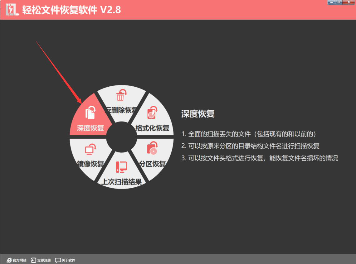 很多人整理电脑文件时,难免会误删某些重要文件,而且又无法通过回收站将文件数据找回来,而自己又不愿意重做文件。那么,为了解决这问题,我们可以用轻松文件恢复软件恢复电脑丢失数据。它恢复的成功率高。考虑到很多人没操作过该软件,本文就为大家分享轻松文件恢复软件恢复电脑丢失村酒野蔬拼音:cūn jiǔ yě shū释义:乡村酿的酒,田野种的菜。形容酒食淡薄,生活清贫。出处:清·无名氏《说唐》第三回守几亩田园,供养老母,村酒野蔬,亦可与知己谈心。”示例:无数据的教程。  轻松文件恢复软件如何恢复电脑丢失数据? 1、首先,我们打开轻松文件恢复软件,根据自己的实际情况来选择恢复电脑丢失数据的类型,这里我们选的是“深度恢复”。  2、然后,我们点击选择丢失的电脑文件数据所在的磁盘,再点击轻松文件恢复软件界面右下方的“开始扫描”按钮。  3、此时,在界面中,我们便可以看到轻松文件恢复软件正在扫描该磁盘中可以恢复的电脑数据。  4、接下来,扫描完成,我们就点击轻松文件恢复软件界面左侧的文件列表,在界面右侧便会展示对应的已经丢失的电脑文件数据,如下图所示。  5、最后,我们勾选自己想要恢复的电脑文件数据,再点击界面右下方的“恢复文件”按钮,轻松文件恢复软件便会恢复电脑丢失的数据。  当电脑文件数据丢失的时候,又无法从回收站将其找到的话,就可以使用轻松文件恢复软件将丢失的电脑数据找回来。它不仅操作简单,而且恢复的成功率也高。 -