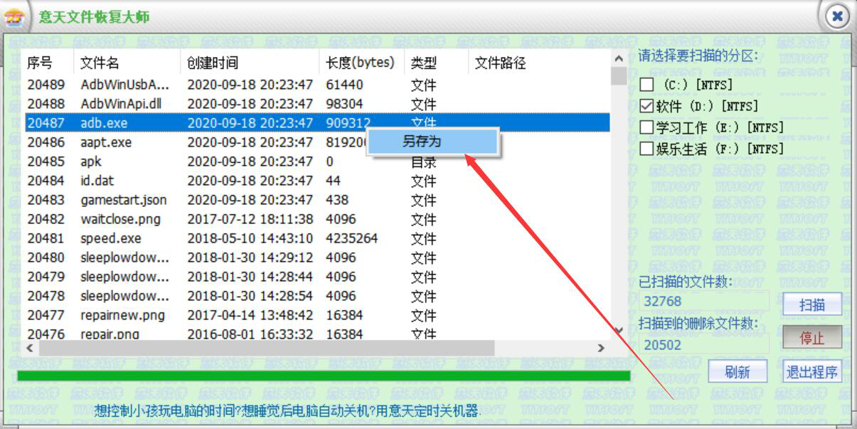 很多人在整理电脑文件的时候,会误删一些重要的文件数据,而且又无法从回收站将其找回,影响了工作。为了解决这一问题,我们可以用意天文件恢复大师扫描恢复电脑文件,找回丢失的文件数据。考虑到很多人不懂如何操作,下面就为大家讲解意天文件恢复大师怎么扫描恢复电脑文件。  意天文件恢复大师如何扫描恢复电脑文件? 1、首先,我们打开意天文件恢复大师,在界面18. 失恋,并不使你痛苦,而你赋予失恋这个现象的附加意义,却将你击溃。右侧,勾选自己想要恢复的电脑文件所在的磁盘,并点击“扫描”按钮。  2、然后,我们在意天文件恢复大师的界面左下方,便可以看到扫描该磁盘的进度,可以恢复的文件越来越多。  3、扫描完成,我们便可以在意天文件恢复大师的界面中,看到该磁盘可以恢复的所有电脑文件,如下图。  4、接下来,我们在意天文件恢复大师的文件列表中,右键单击自己想要恢复的电脑文件,并在右键菜单中点击“另存为”选项。  5、此时,意天文件恢复大师便会弹出另存为窗口,我们选择电脑文件恢复后的保存路径,并对文件命名,再点击“保存”按钮。  6、最后,我们在刚才设置的保存路径中便可以看到电脑文件已经被意天文件恢复大师恢复了。  不小心误删了电脑文件,而又无法从回收站将其恢复的话,就可以用意天文件恢复大师恢复电脑文件。在扫描磁盘的过程中,如果想要恢复的电脑文件已经扫描出来了,就可以停止扫描,直接恢复即可。 -