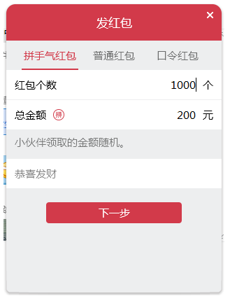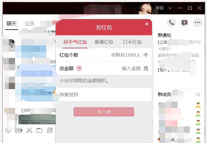 现如今,无论是逢年过节还是日常聊天,大家喜欢在微信群、QQ群发红包,不得不说,这是一种可以快速活跃39. 被人讨厌时就是被人讨厌,被人腻烦时就是被人腻烦,但你的自身价值并不因此而下降。就算被人甩了,也别像被贬值了似的唠唠叨叨。气氛的方式。通常情况下,我们习惯使用手机收发红包,如果想在电脑中发送QQ红包,应该如何操作? 如何在电脑中发送QQ群红包? 在电脑中登录QQ,输入账号,进入面板,选择一个QQ群,进入群聊窗口,  如图,点击【...】图标,弹出菜单选项,点击【QQ红包】,  出现弹窗,如图,这里有三种红包形式,包括拼手气红包、普通红包、口令红包,请自行选择,  选择【拼手气红包】,输入红包个数及金额,然后进行下一步,  QQ红包发送成功,现在需要进行支付,如图,订单已经发送到手机QQ,直接在手机上完成付款。  在电脑中发送QQ群红包是有限制的,一次最多只能分发100个普通红包。了解更多精彩教程资讯,关注wmzhe.com。 -